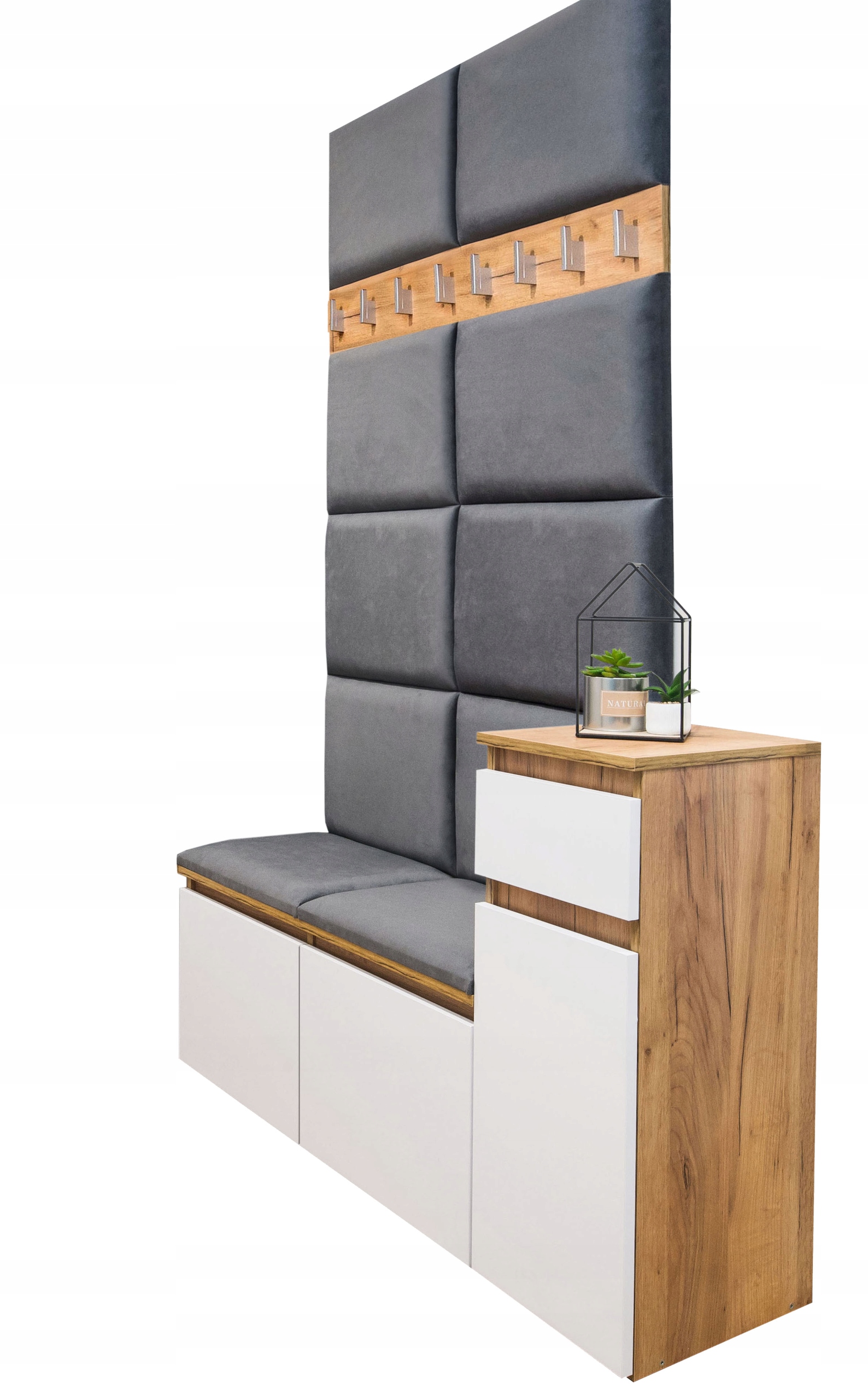Представлений гарнітур для передпокою - це створений нами готовий гарнітур, який ідеально заповнить кімнату. Це невеликий за своїми розмірами, але в ньому можна розмістити найчастіше використовуване взуття та куртки, а на м'яке сидіння покласти свій улюблене взуття.