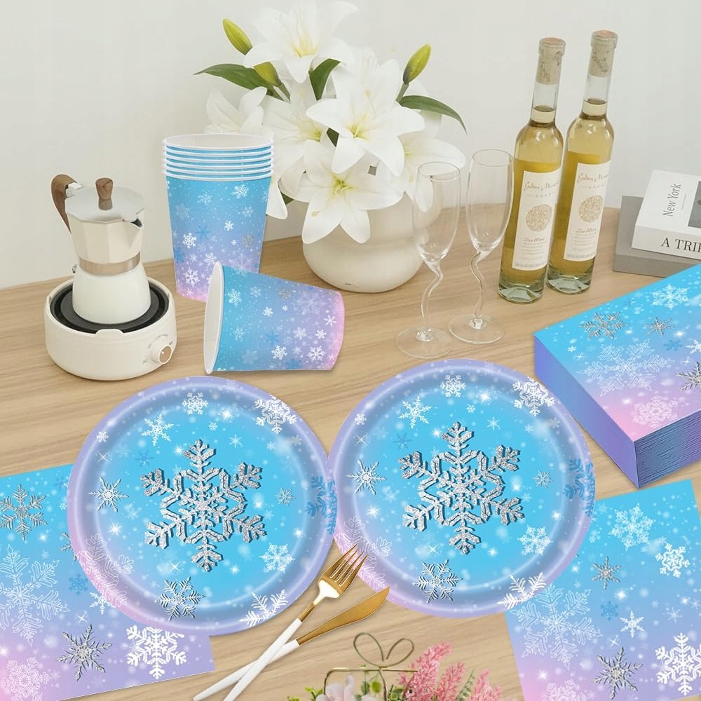 Наш набір виготовлено в красивий градієнтний синьо-фіолетовий колір, прикрашений ніжними візерунками сніжинок, ідеально передає магію зимового пейзажу. Елегантний дизайн додає чарівності будь-якій події – будь то різдвяна вечірка, новорічна вечірка, зимове весілля чи свято дитини.