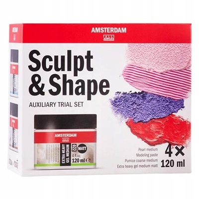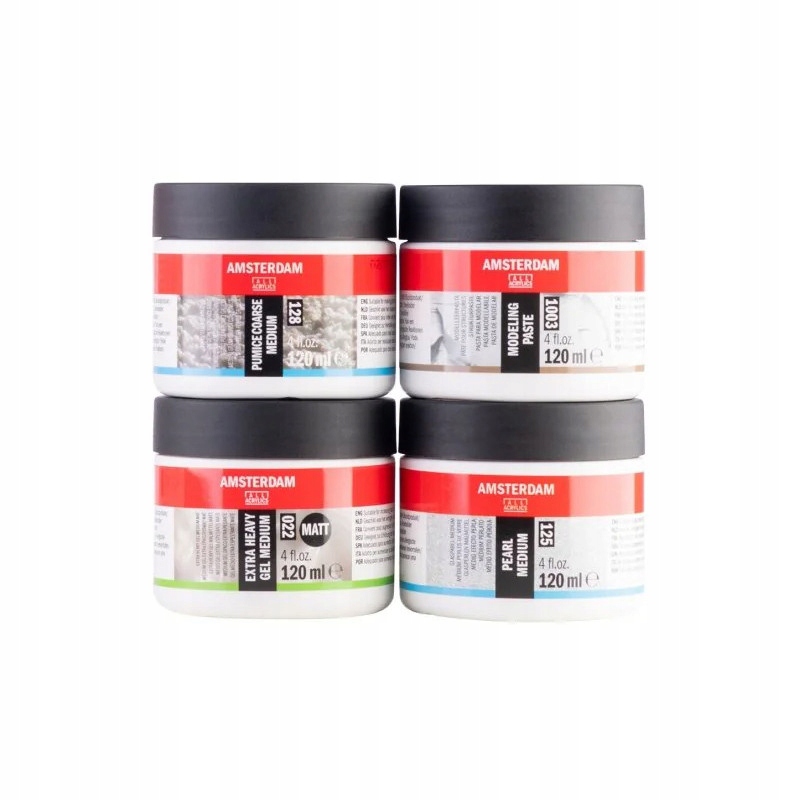 Набір носіїв для акрилових фарб із серії Amsterdam від Royal Talens. Баночки ємністю 120 мл містять: гладку моделюючу пасту, середньозернисту моделюючу пасту, надзвичайно важкий матовий гель середній і перламутровий середній (зі скляними кульками). Носій можна змішувати з акриловими фарбами або наносити самостійно за допомогою шпателя чи ракеля. Пасти та гелі надають роботам неповторний характер - вони дозволяють створювати об'ємні текстури.