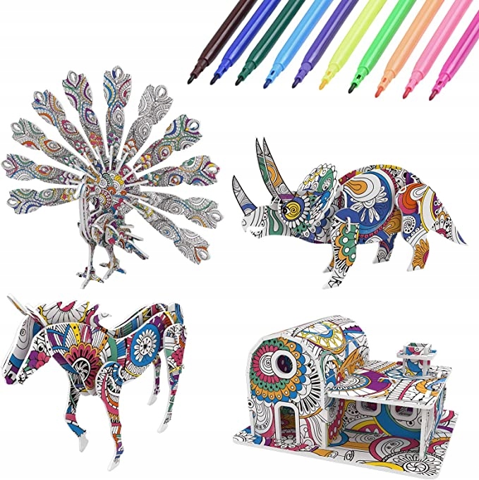 3D-набір кольорових пазлів: ця 3D-розмальовкаскладається з носорога, павича, кінь, будинок + 10 фломастерів різних кольорів. Діти можуть самостійно збирати та розфарбовувати ці пазли.