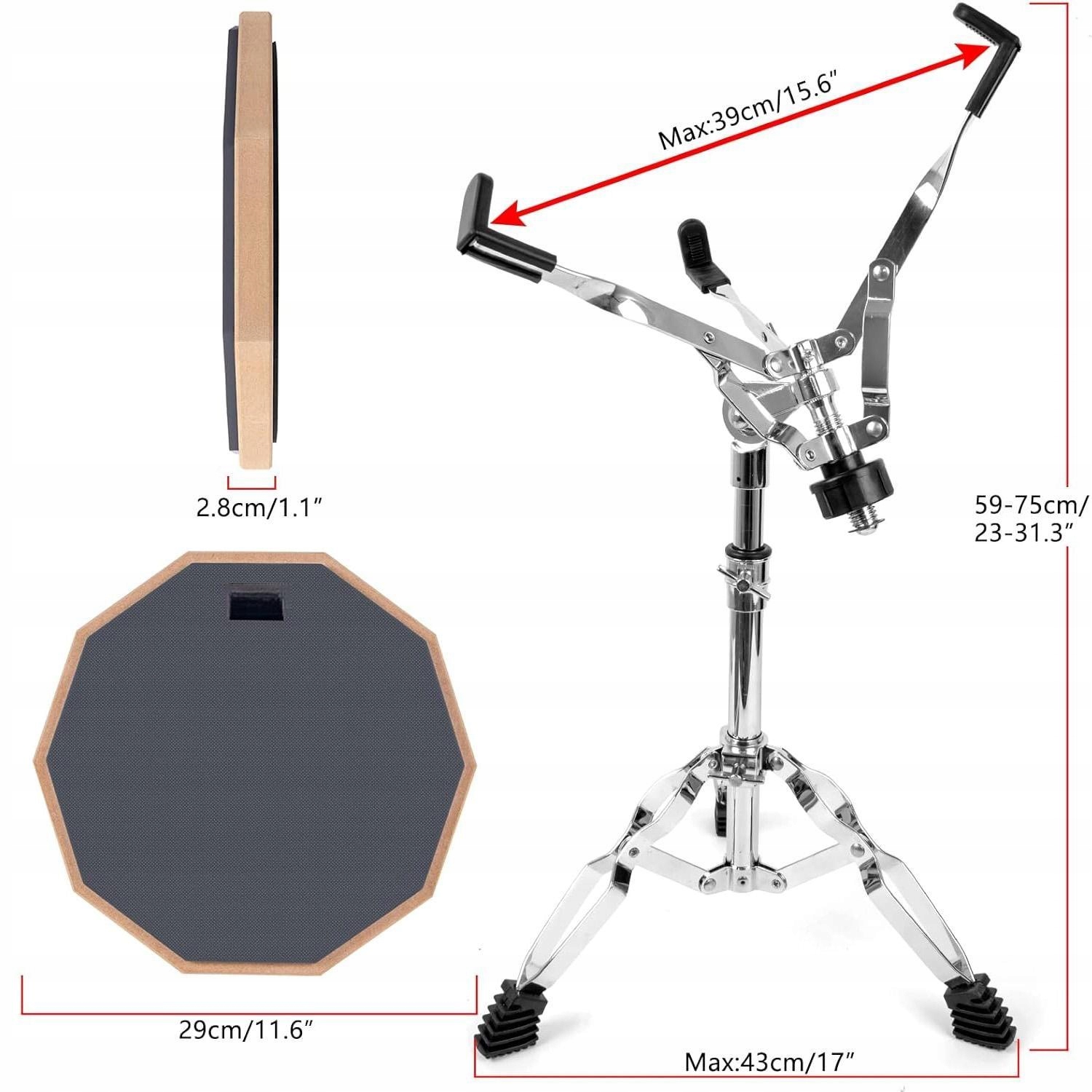 Ця барабанна підставка підходить для барабанів діаметром від 20,3 см до 37 см. Він має гумову ручку, складну конструкцію та подвійні опори для стабільності. Регульована висота. Підходить для дорослих і дітей.