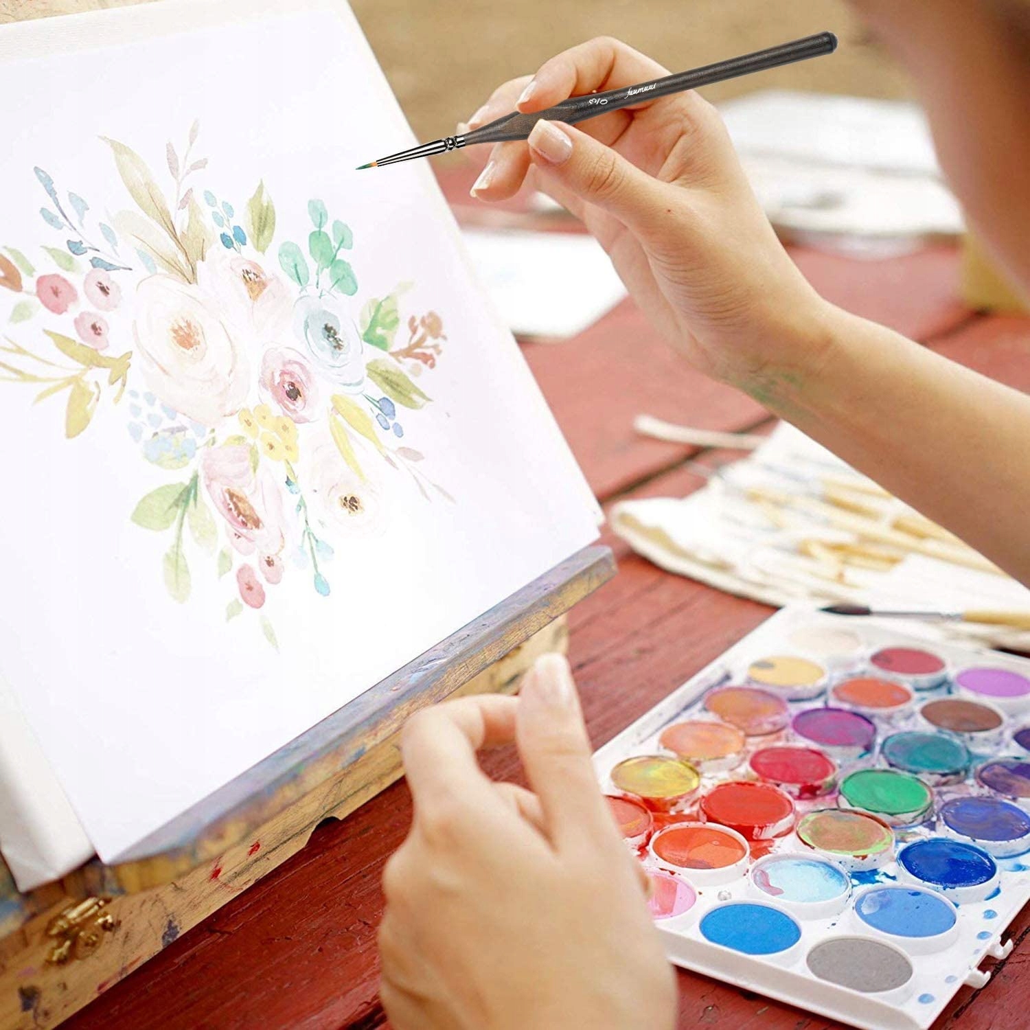 - Коричневі та дерев’яні ручки забезпечують комфорт під час тривалих сеансів малювання, а м’які наконечники пензля ідеально підходять для дрібних деталей.