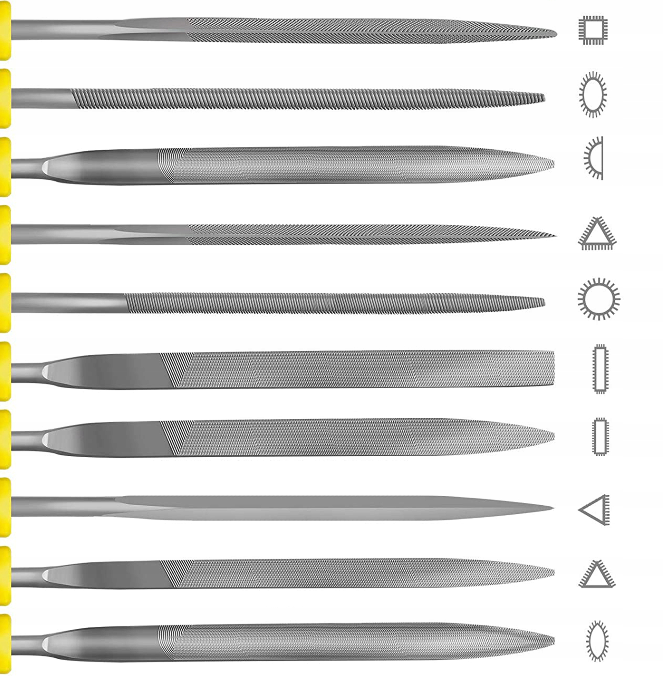 12 x 100 м надфіль: плоский, плоский конічний, круглий, напівкруглий, овальний, квадратний, трикутний, ножовий, баретний, хрестовий, із заокругленими краями та шпагою