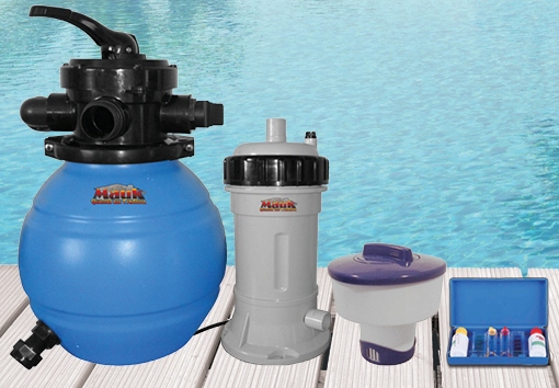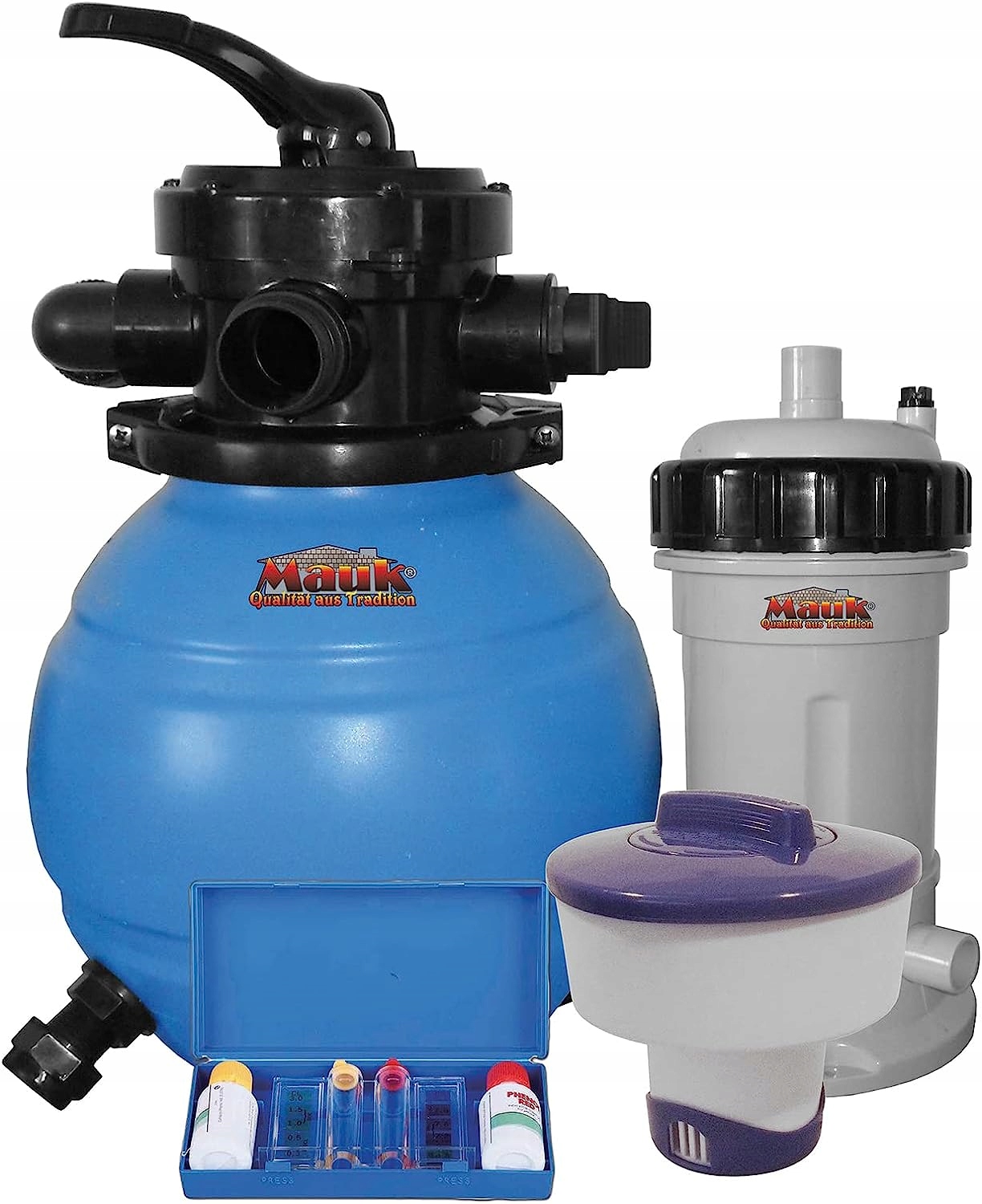 Підходить для всіх звичайних басейнів до 18 м³. Швидко та легко обладнайте свій швидкозбірний басейн, каркасний басейн, басейн зі сталевою стінкою або басейн з нержавіючої сталі, а також свій басейн для плавання піщаним фільтром MAUK. У розкладеному стані пристрій можна поставити на відстані приблизно 3-4 м від басейну на стійку та рівну поверхню. Для захисту і гарного зовнішнього вигляду рекомендується спорудити захищене місце (укриття) для установки піщаного фільтра. Практично: в комплект поставки також входить розподільник хлору та тестовий набір
