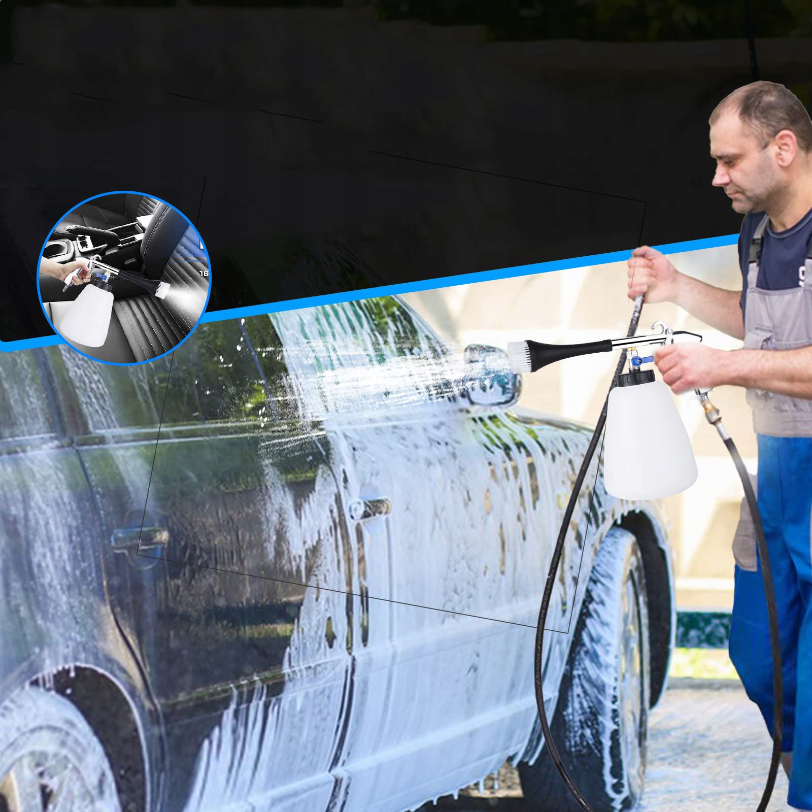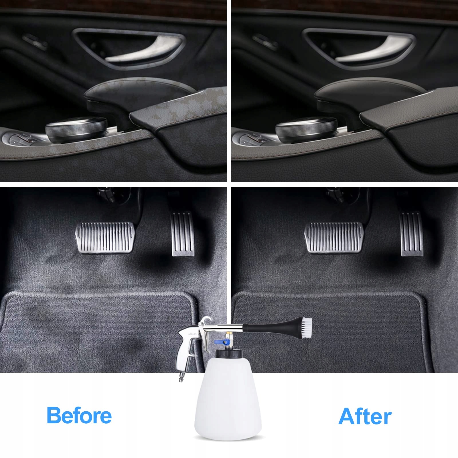 Пістолет для очищення стисненого повітря підходить для чищення вовняних сидінь автомобілі, шкіряні автосидіння, панель приладів, кермо, дверні полотна, килими, килимки, автомобілі тощо. Санітарні куточки, такі як кондиціонери, також можуть легко видалити плями