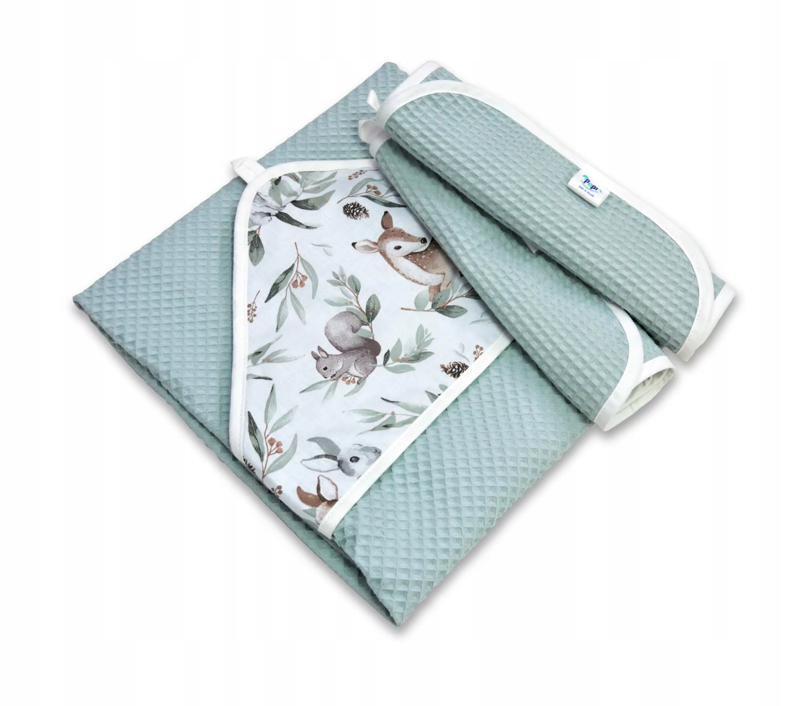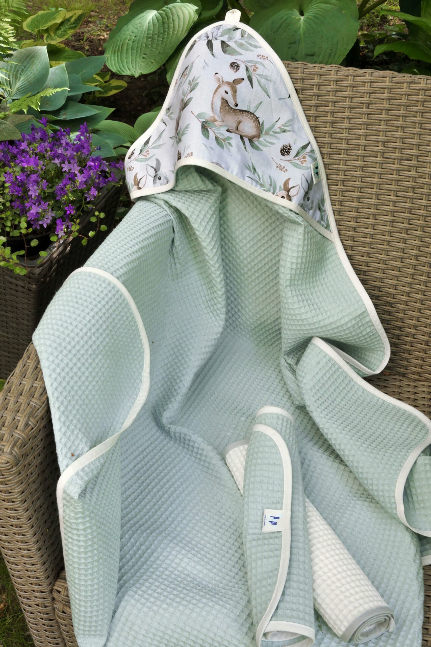 Капюшон і м'яка натуральна тканина з унікальною вафельної структурою також перетворять звичайний рушник в практичне сповивання, ковдру або ігровий килимок. Два маленьких рушники завжди під рукою, щоб витерти обличчя та ручки дитини.