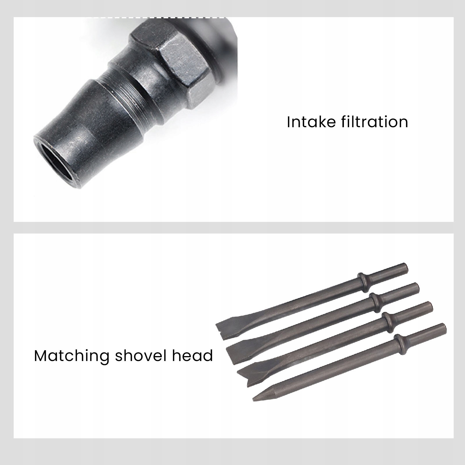 1, ЛЕГКА ЗАМІНА: молоток має швидкозмінну рукоятку, яка полегшує заміну зубил, що дає вам гнучкість, на яку ви можете розраховувати 2, МІЦНА КОНСТРУКЦІЯ: довга труба з легованої сталі Термічно оброблений поршень гарантує, що молоток витримує важкі умови, часті падіння та вплив агресивних хімічних речовин 3, ЗРУЧНИЙ ТА ЕФЕКТИВНИЙ: ергономічна рукоятка пневматичного молотка зменшує вібрацію та підвищує комфорт під час роботи, дозволяючи працювати довше та ефективно виконувати завдання 4, КІЛЬКА ФУНКЦІЙ: Додаткові функції пневматичного молотка. Лопата включає випускний патрубок з дифузійною ручкою, вбудований регулятор потужності та професійний сенсорний курок. 5, ШИРОКЕ ЗАСТОСУВАННЯ: пневматична лопата оснащена 4 насадками для долота, що робить її зручним електроінструментом для різання металевих панелей, закріплення вихлопних систем, скоблення поверхонь, сколювання та виконання кузовного ремонту