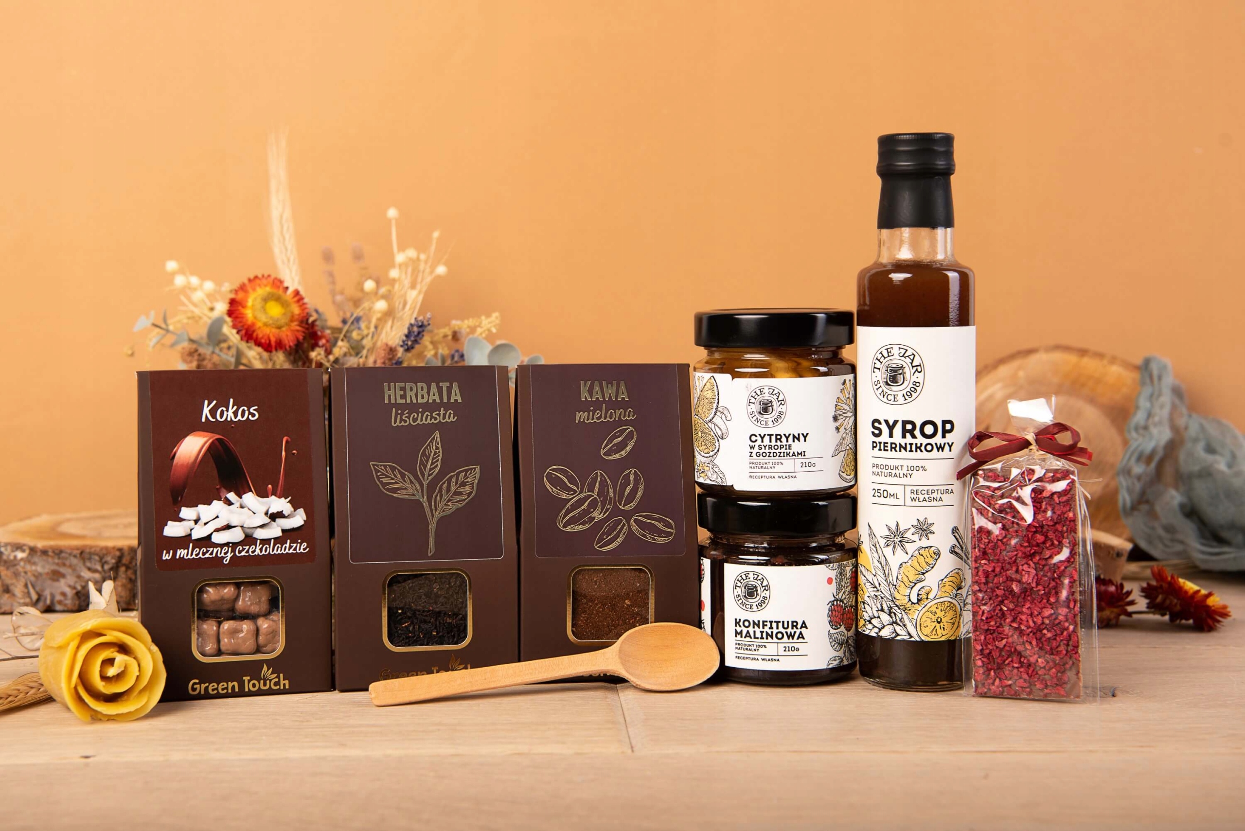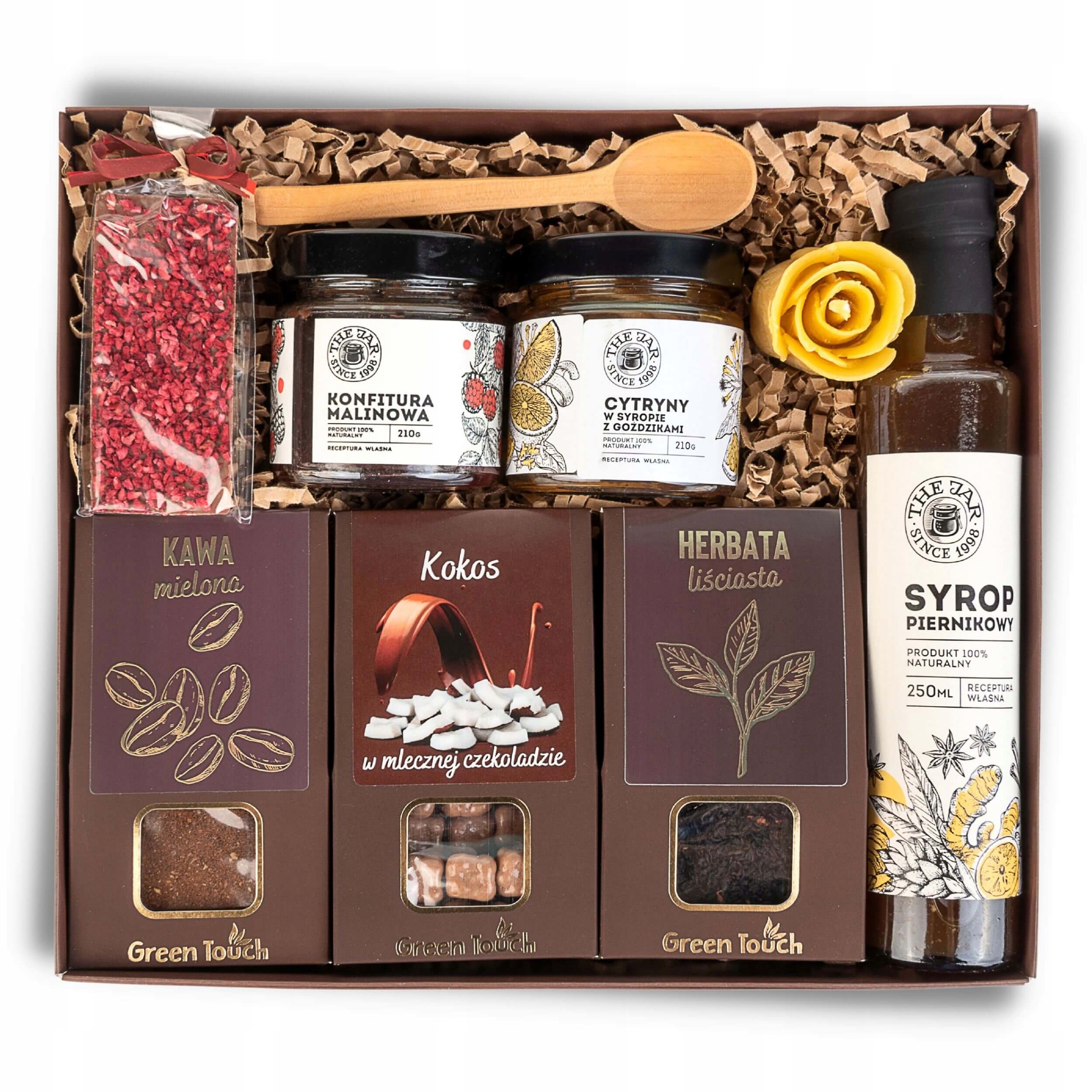 Внутрішня частина містить велику кількість відібраних продуктів преміум-класу: від енергійної 100% кави арабіка, освіжаючого чаю з фруктами до солодкі делікатеси у вигляді шоколадних цукерок і джемів, підсолоджених тростинним цукром. Вони доповнюються маленькими, але унікальними аксесуарами - дерев'яною ложкою, просоченою лляною олією, і свічкою у формі квітки троянди з бджолиного воску, що додає неповторного шарму всьому.