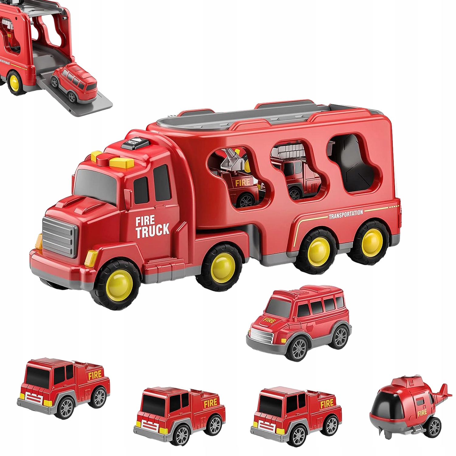 🚒 Цей набір із 7 пожежними транспортними засобами був розроблений для невеликих пожежників. Він містить більшу пожежну машину та 6 маленьких автомобілів (рятувальна машина, пожежна машина, вертоліт, спринклер, пасажир та позашляховик).