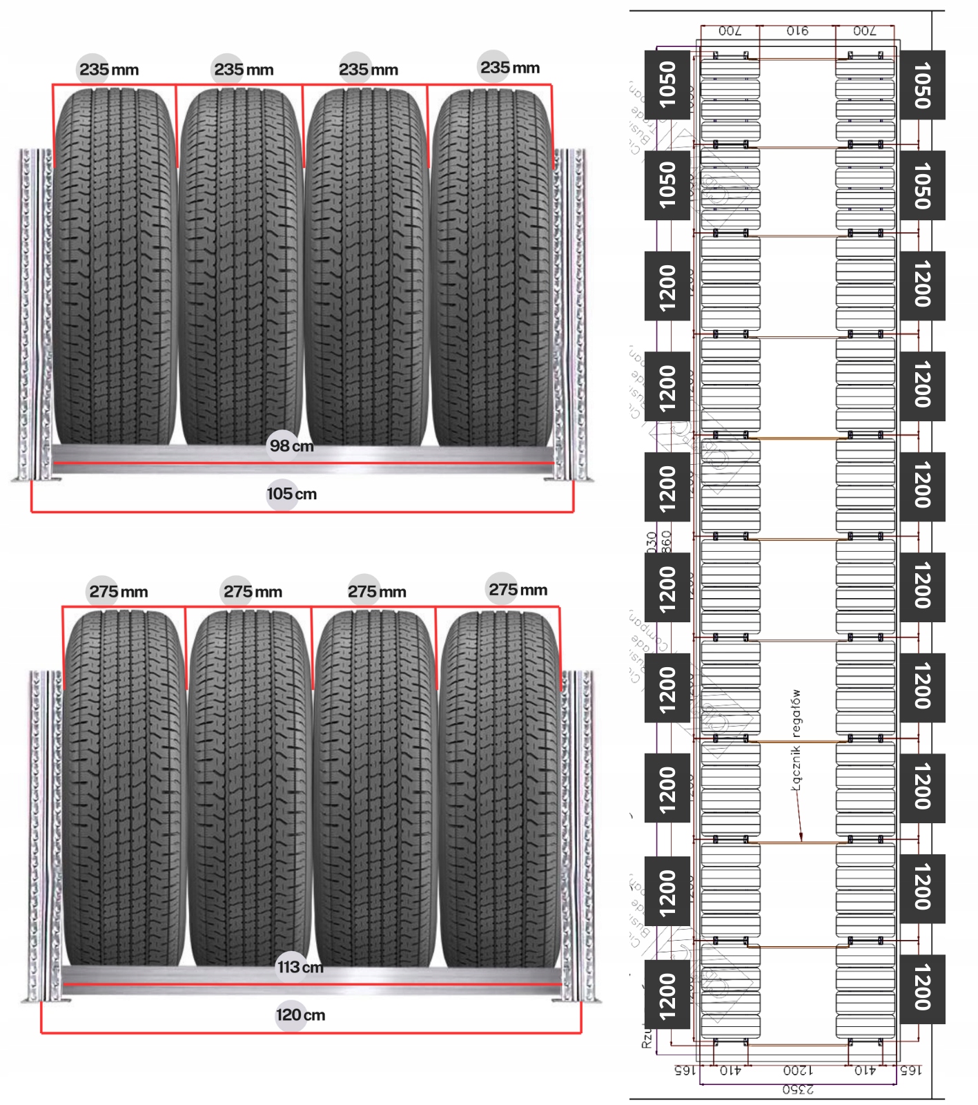 - Максимальна ширина шини/кола: 275 мм (промінь 1200 мм) та 235 мм (промінь 1050 мм)