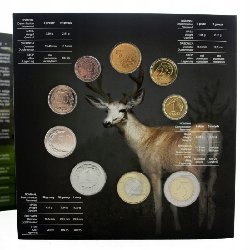 Блістер містить опис благородного оленя трьома мовами: польською, англійською та німецькою, а також детальну технічну інформацію про монети.