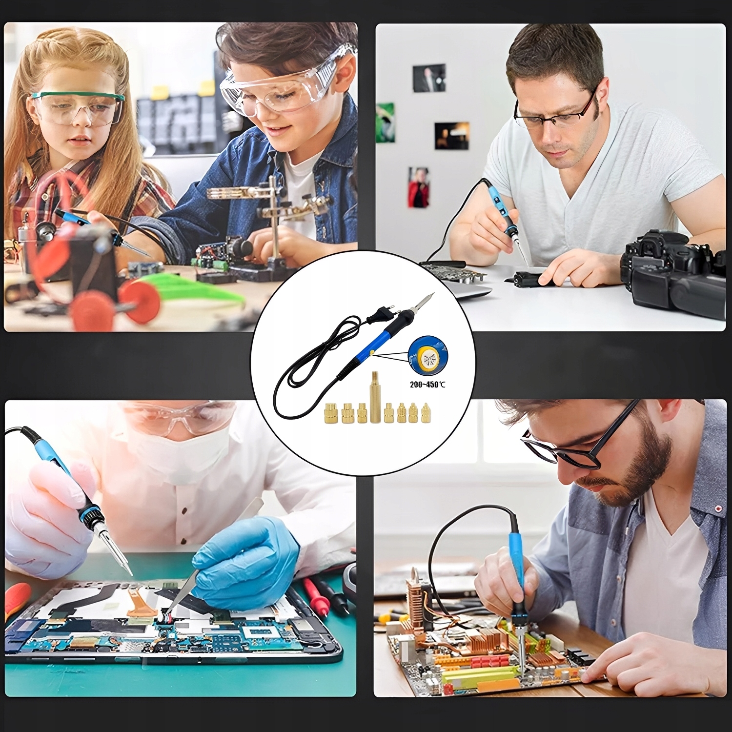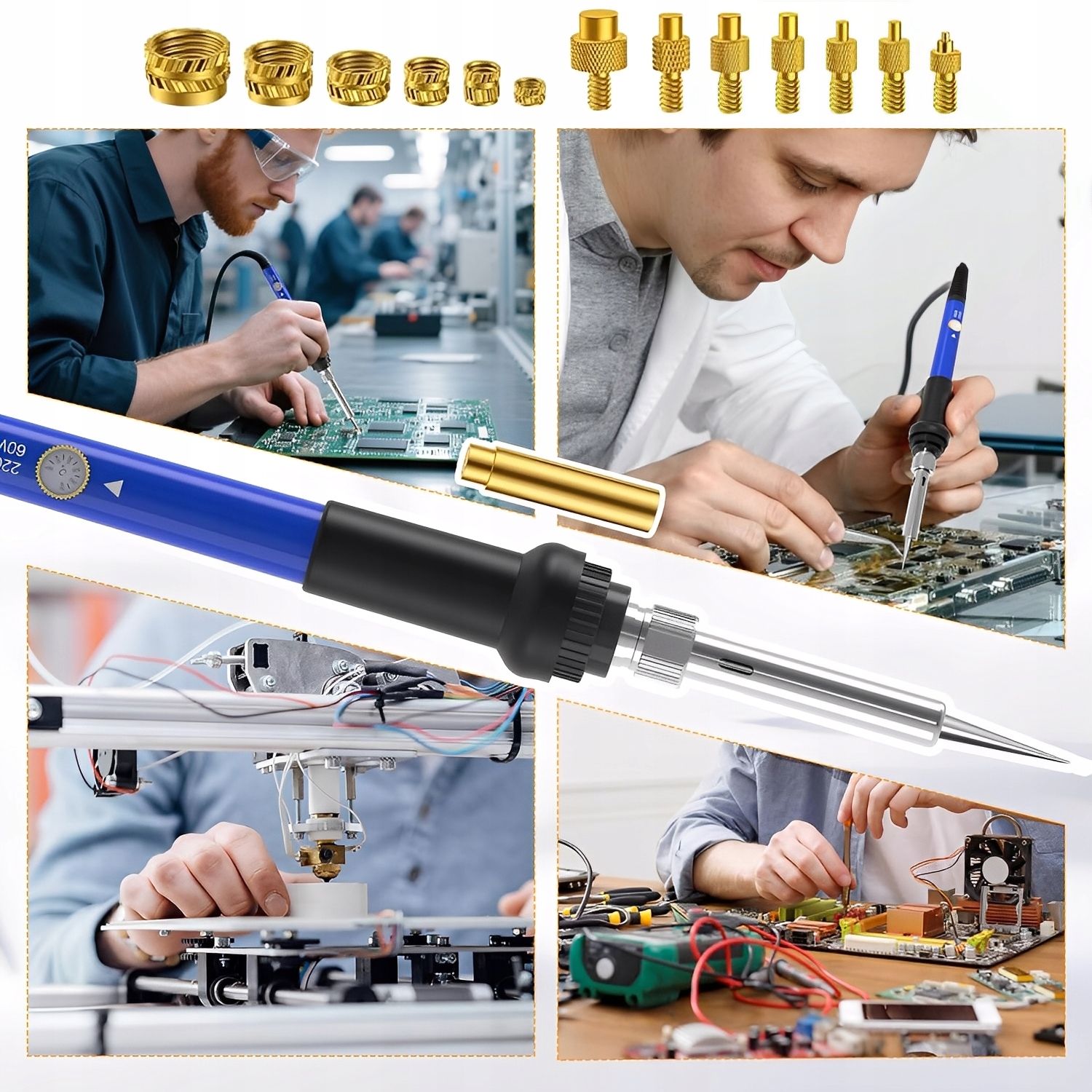 Універсальність і точність: завдяки регульованій температурі та змінним наконечникам набір ідеально підходить для встановлення різьбових вставок у різні типи матеріалів, що використовуються в 3D-друкі, наприклад PLA, ABS або PETG.