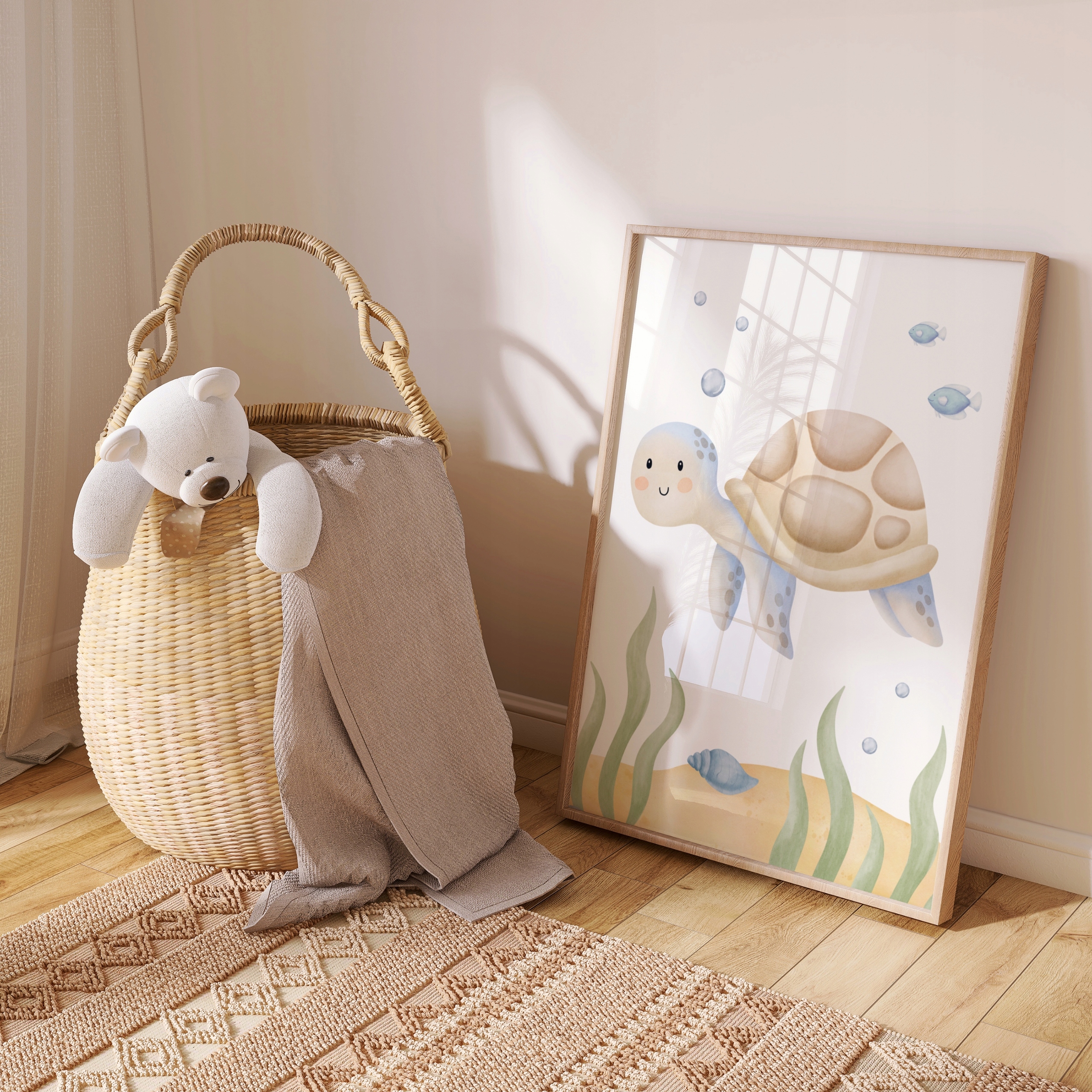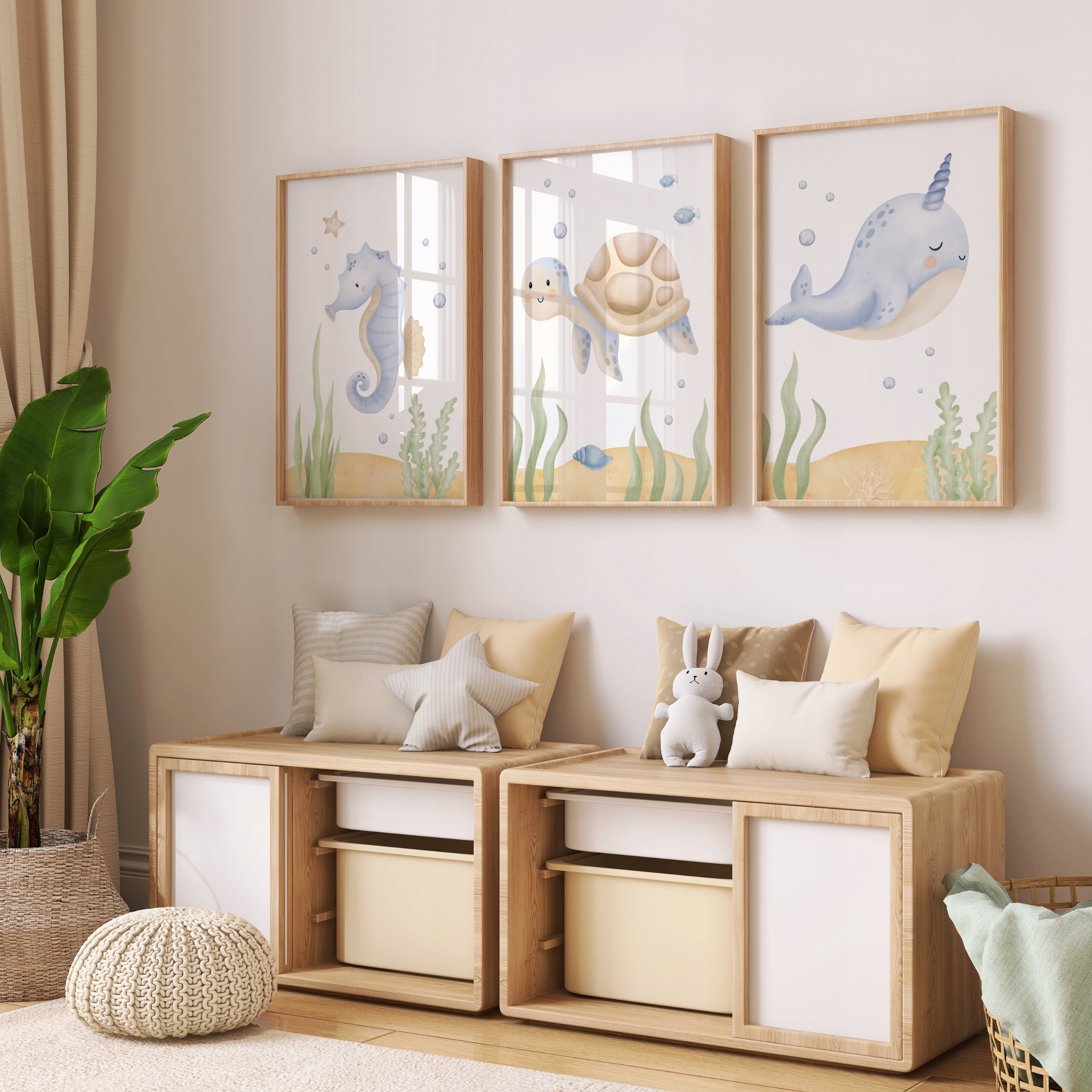 - Мотиви та кольори плакатів ідеально вписуються в різноманітні оформлення дитячих кімнат у морському, морському або приморському стилі. тропічний.