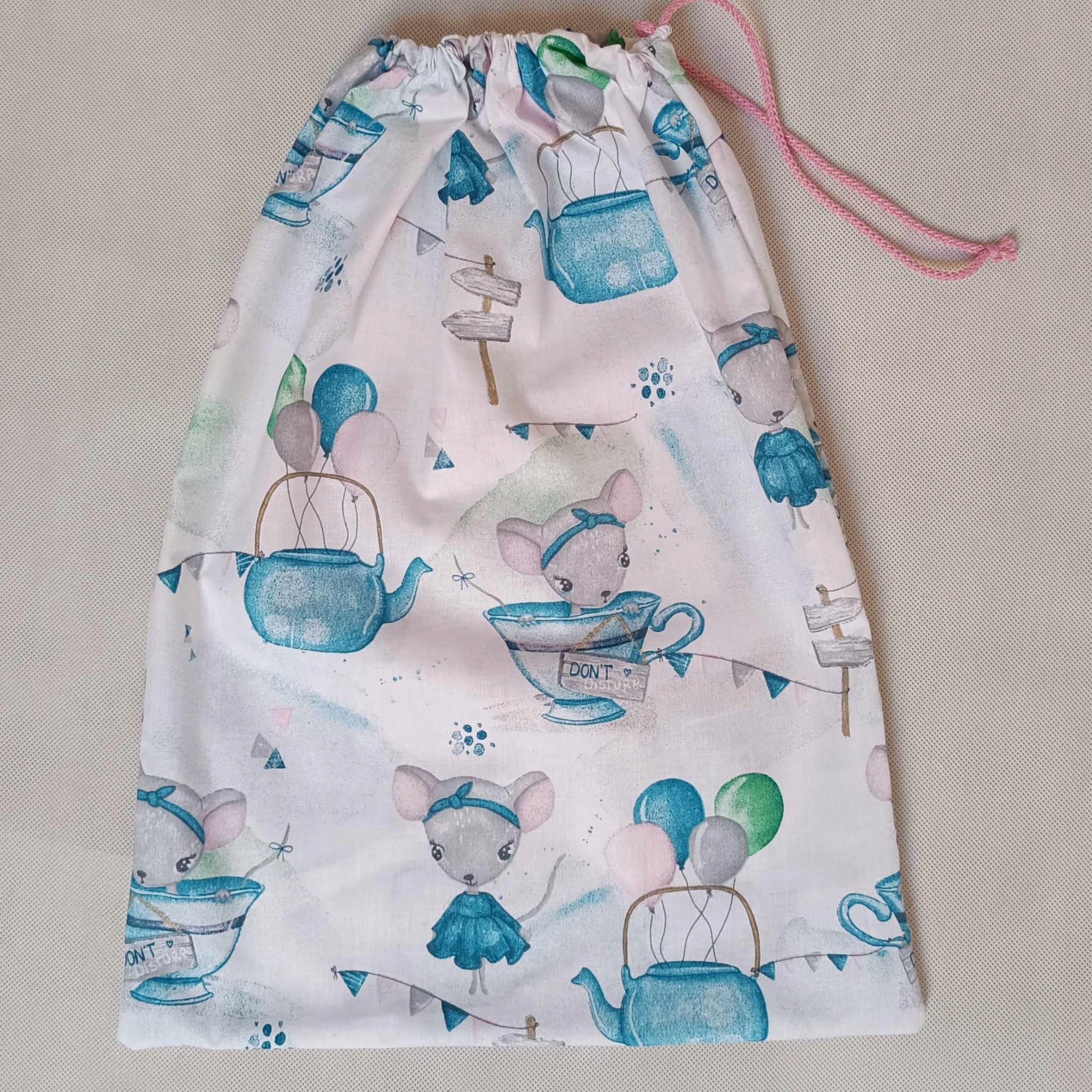 Меншу сумку можна використовувати для тапочок або запасного одягу, а у більшу сумку можна помістити ковдру з подушкою, сумки мають бавовняний шнурок.