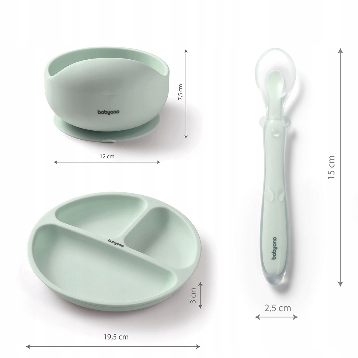 силіконова миска, тарілка та ложка - ідеальний набір для кожної дитини , яка починає свою пригоду з незалежною їжею. Чаша з присосковою чашкою забезпечує стабільність , завдяки чому ви уникнете небажаних розводів та бруду. Закруглені краї та ергономічна форма полегшують дитині вивчити незалежну їжу , а три відділення тарілки дозволяють розділити страву на різні частини, що спонукає вас спробувати нові страви. 4 , виготовлені з високоякісних матеріалів, посуд міцні, безпечні і їх можна промивати в посудомийній машині та нагрівати в мікрохвильовій пічах . Це ідеальний вибір для батьків, які хочуть познайомити нові аромати в раціоні дитини безпечно та зручно.