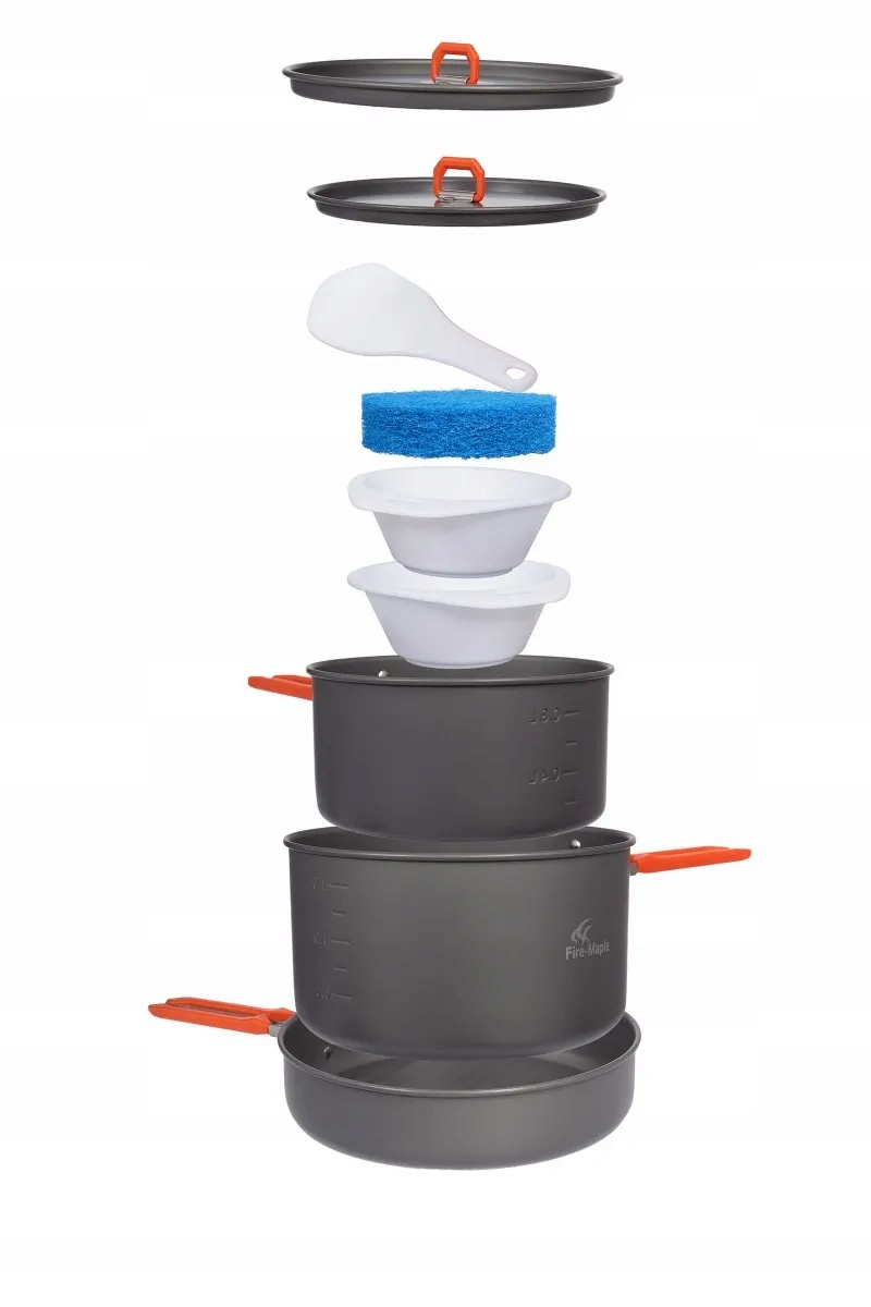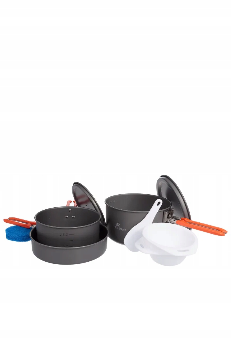 Повнофункціональна портативна кухня у вашому рюкзаку. Дорожній набір посуду Fire Maple дозволяє готувати поживні страви з кількох страв. Все це в похідних умовах, на лоні природи. Набір Feast 3 складається з двох каструль і сковорідки з рифленим дном (зменшує прилипання їжі). Кожна посудина має складну ручку з замком, що запобігає її складанню під час використання. Ручки мають пластикове покриття, яке захищає від опіків. Всі елементи набору виготовлені з високоякісного анодованого алюмінію, який додатково загартований. Це легкий і дуже міцний матеріал, який легко миється. обидві каструлі мають кришки, більшою з яких також можна накрити сковорідку. Набір дуже компактний - весь посуд поміщається «одна в іншу», і ви можете заховати все в легку сітчасту кришку. Виробник оснастив набір додатковими аксесуарами, корисними для приготування їжі та догляду на природі - ложкою для змішування, двома мисками та губкою для чищення.