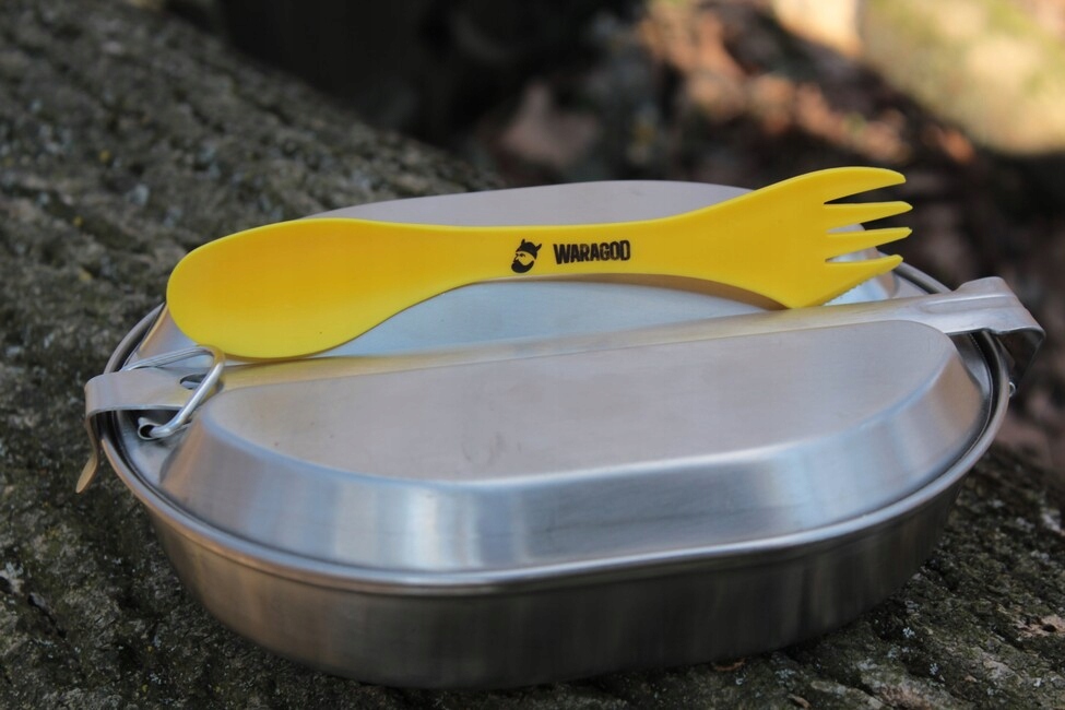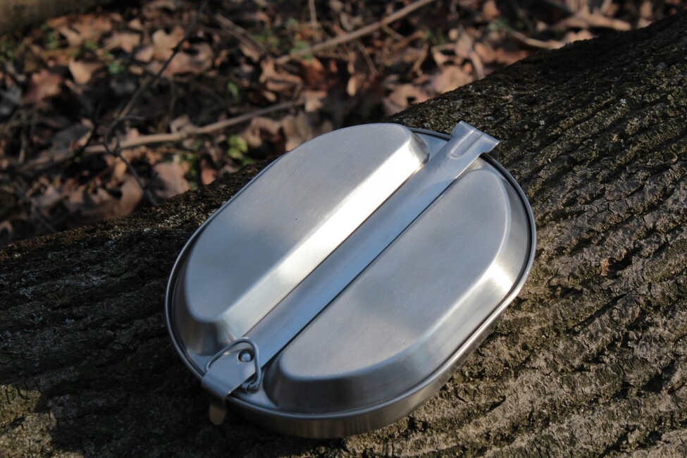 Набір посуду від німецького виробника MFH, що складається з двох частин, до складу якого входить сковорода (для варіння, смаження або запікання) і тарілка з двох частин. Набір має овальну форму і виконаний як їдальні, які використовуються американською армією в польових умовах. Застосування: туризм,.