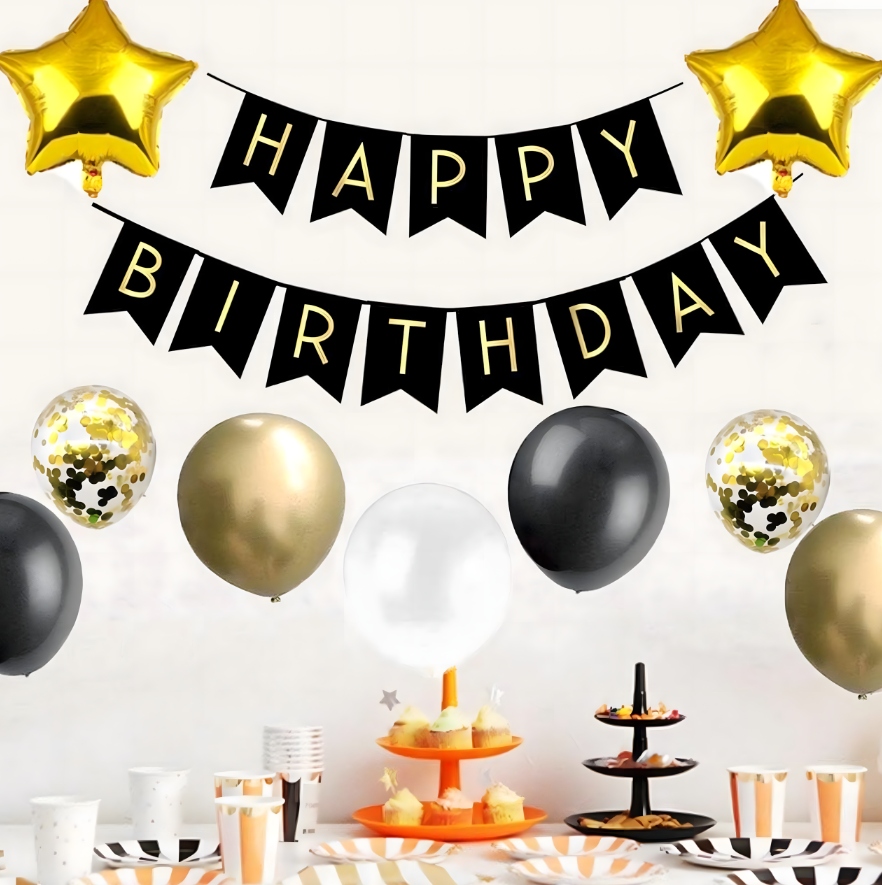 Елегантний декоративний набір у відтінках чорного, золотого та білого з додаванням золотого конфетті — ефектний спосіб підкреслити особливу річницю. Повний набір дозволяє створити вражаючий інтер’єр або зовнішній простір, а золота завіса та банер «Happy Birthday» створюють ідеальний фон для фотографій на пам’ять.