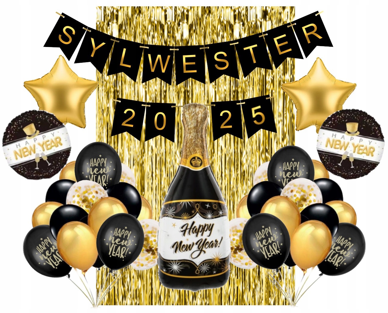 Набір декорацій золотого та чорного кольорів для новорічної вечірки.