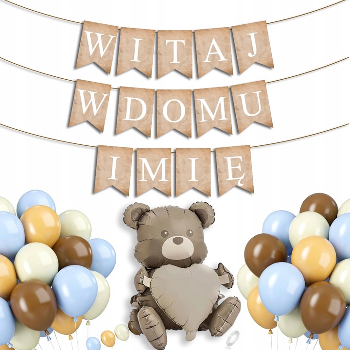 Набір повітряних кульок ЛАСКАВО ПРОСИМО ВДОМА З ПЛЮШЕВИМ ВЕДМЕДИКОМ ІМ'Я привітання дитини бежевий синій