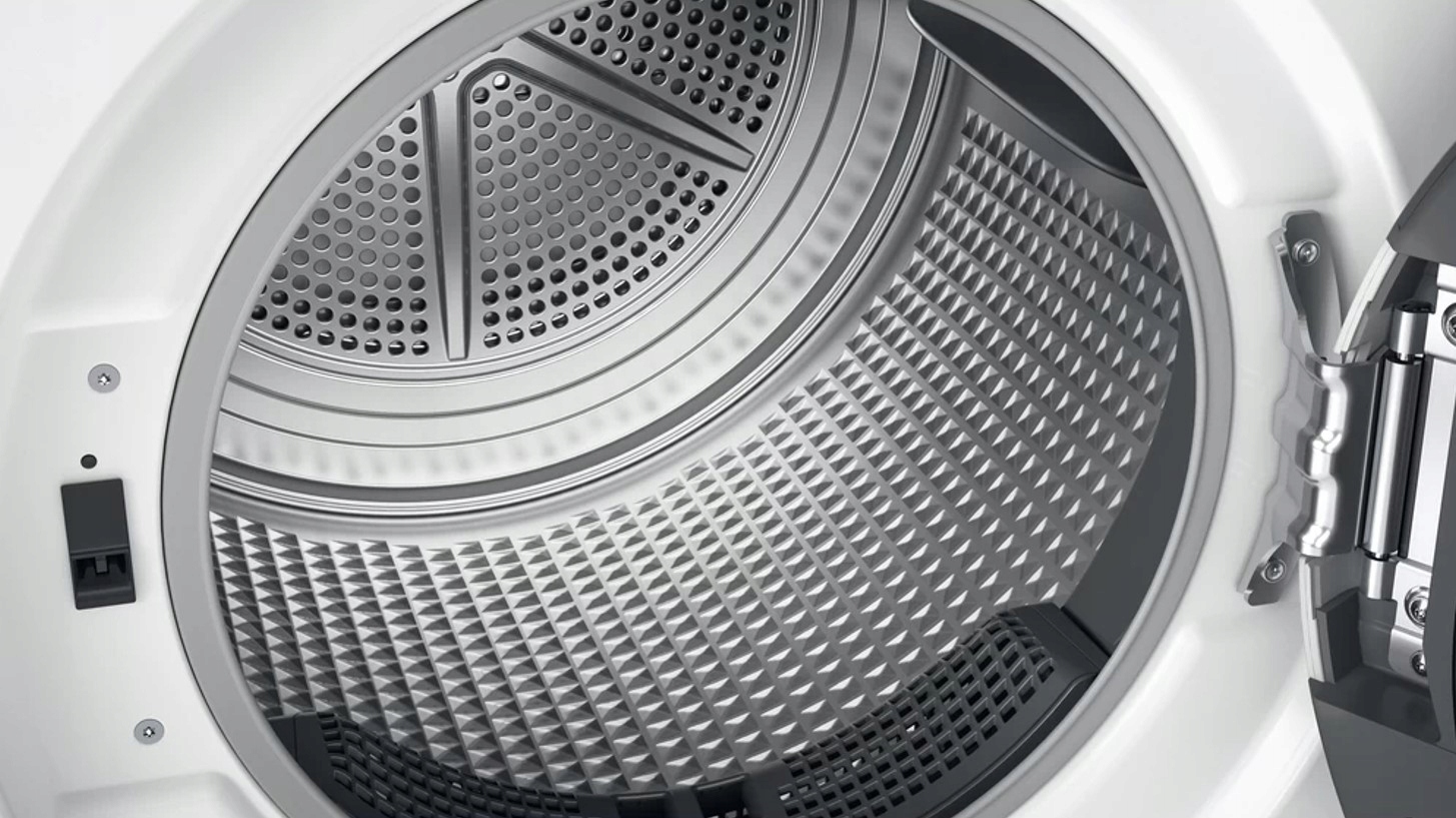 Барабан цієї високоякісної сушильної машини має спеціальний візерунок шпильок, розроблений для забезпечення чудових результатів сушіння та найкращого догляду за усі тканини.