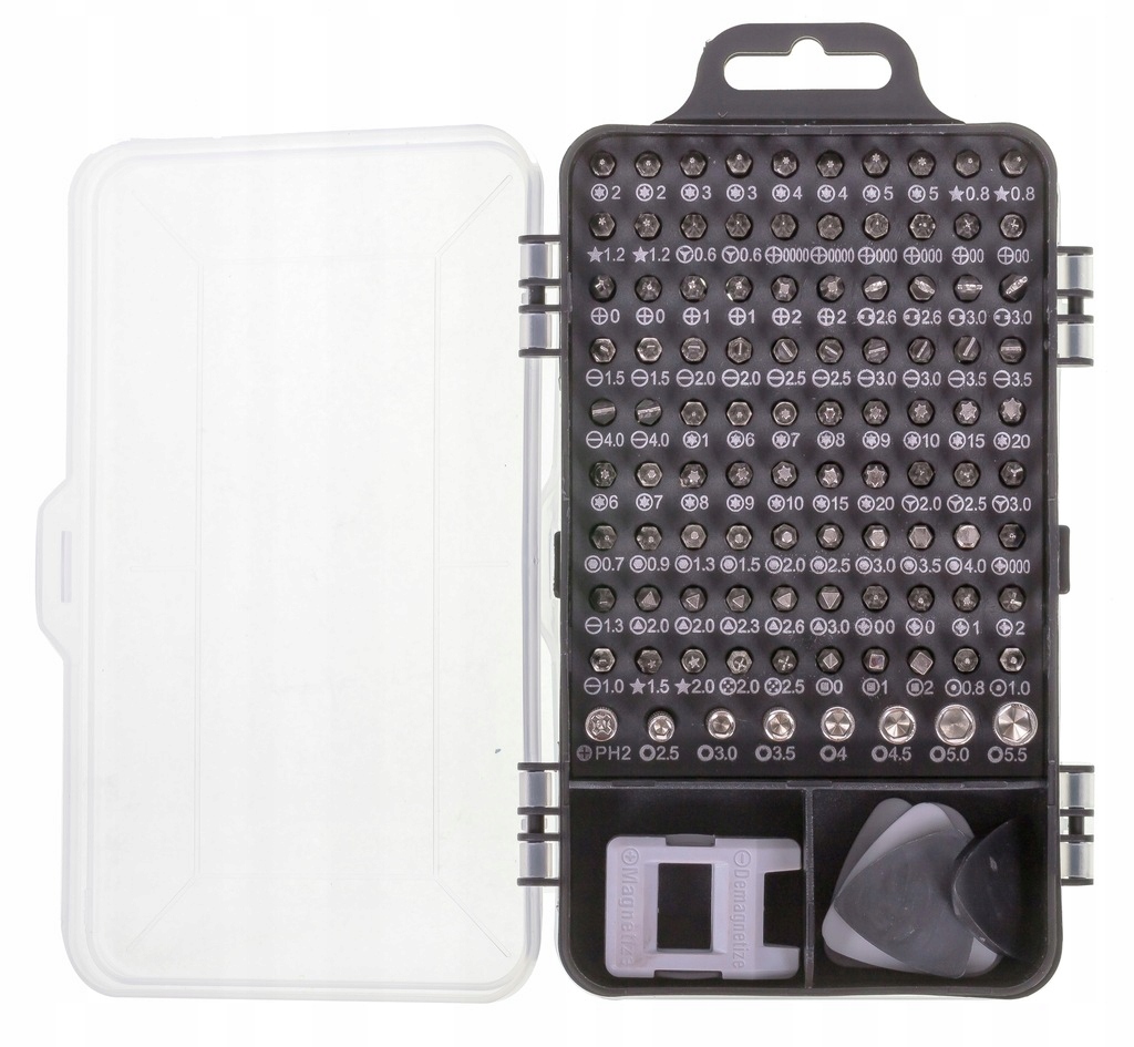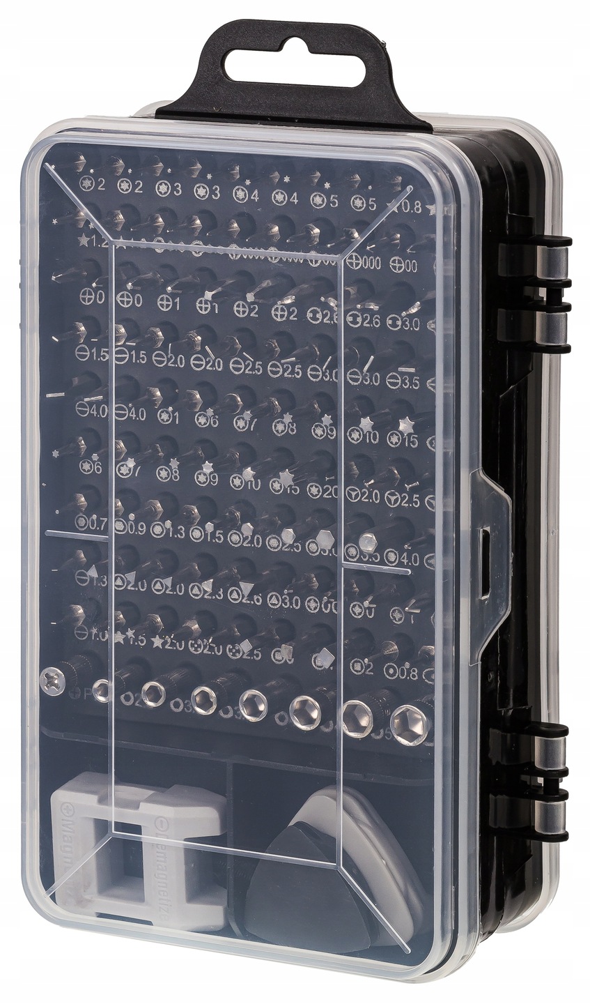- великий набір- містить 115 елементів, включаючи 98 змінних викруток