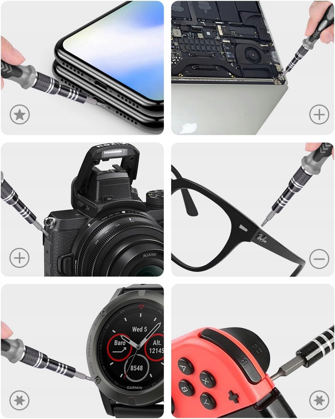 19 корисних інструментів для ремонту: безпечні пластикові інструменти для відкриття, антистатичний пінцет, виштовхувач SIM-карти, присоска для РК-дисплея, інструмент для відкриття трикутника, пластикова лопатка, інструмент для намагнічування та розмагнічування тощо.