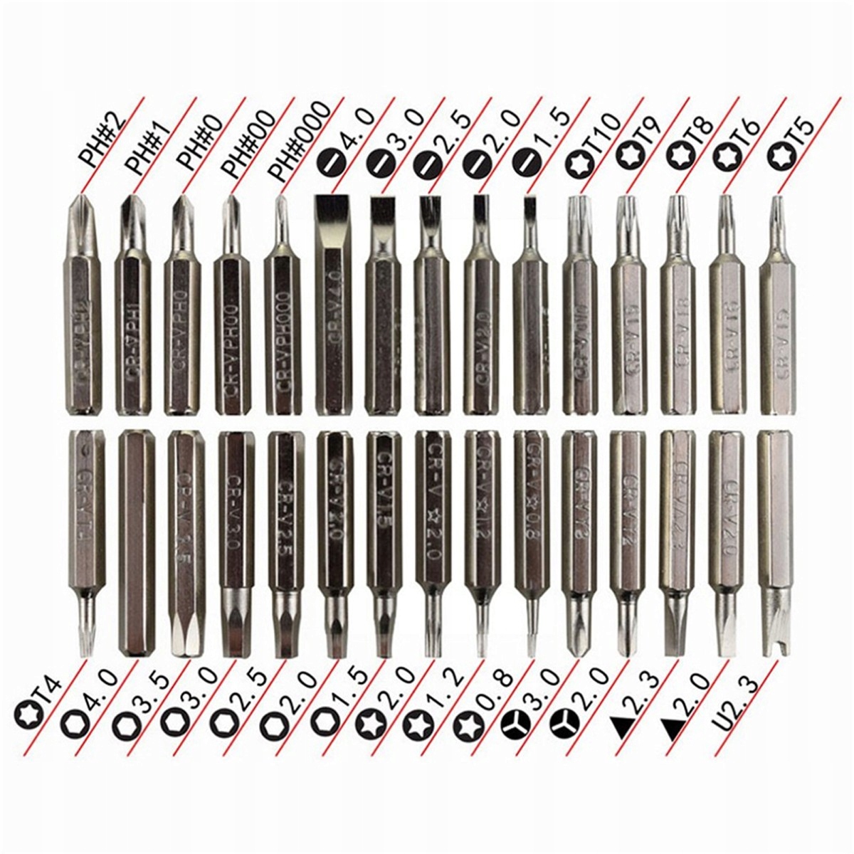 Набір містить різноманітні насадки, зокрема трикутні, гайкові, триспицеві, зірчасті, шестигранні, плоскі, хрестові та Torx. Завдяки цьому ви можете виконувати різноманітні ремонти та обслуговування пристроїв.