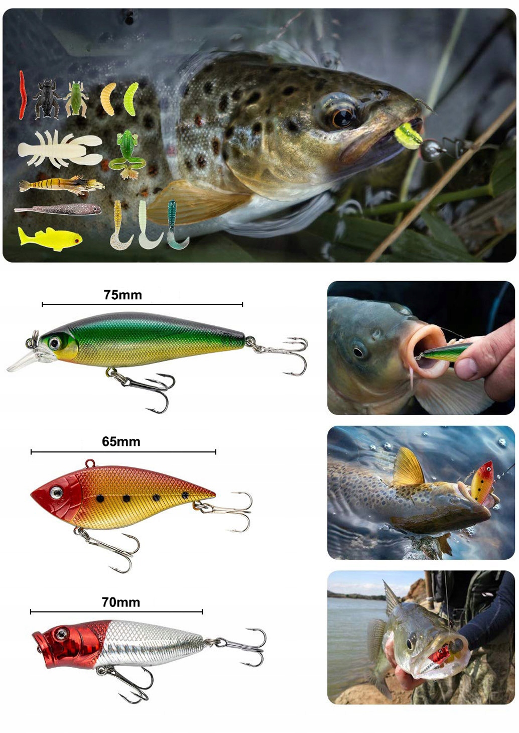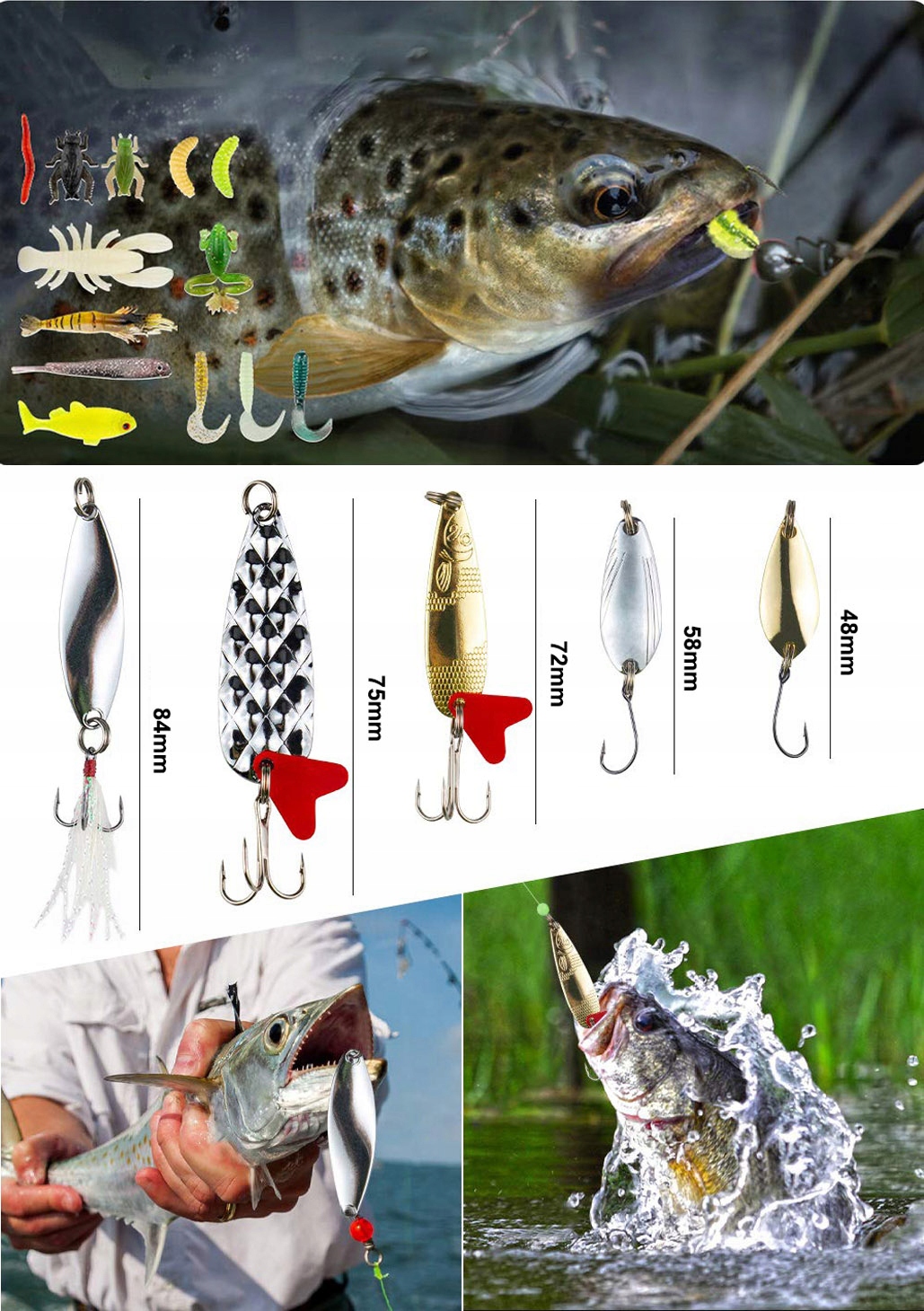 Приманки, подібні до життя: Приманки рибного господарства мають точно розроблену форму, 3D -рибальський стерео та реалістичні масштабні конструкції, завдяки яким риба виглядає більш яскравою та реалістичною, як жива риба у воді. Завдяки справжній обшивці рибальської ложки вони демонструють блискучий спалах у воді, а більш світловідбиваючі поверхні приваблюють рибу і змушують їх потрапити. Ідеальна приманка для риболовлі, яка легко обманює цільову рибу.
