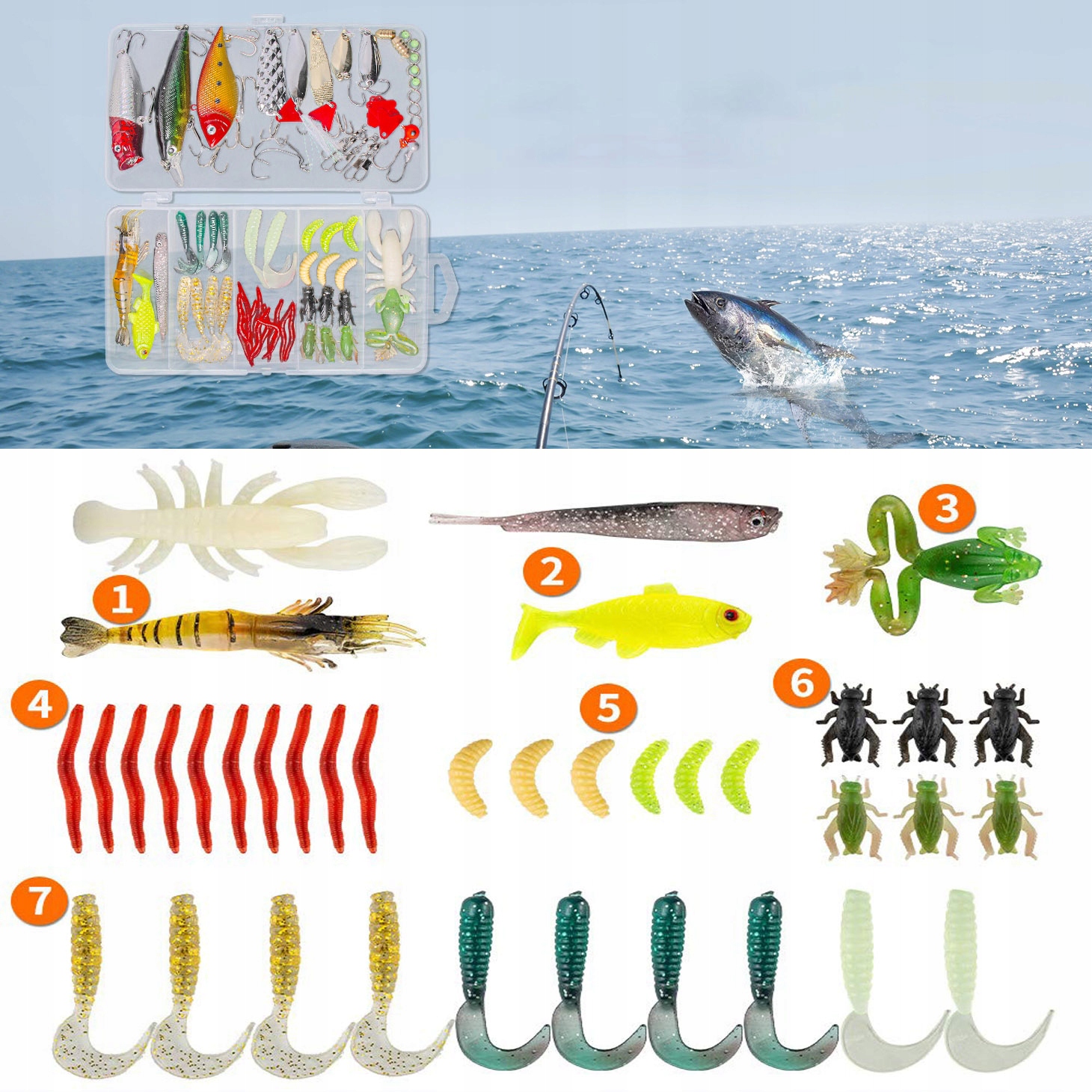 широке використання: чудово працює як для солоної води, так і для прісної води та добре функціонує у всіх шарах води. Вся приманка для форелі та басової риболовлі широко використовується та ретельно підбирається, відповідає потребам різних сортів риби, якими ви рибаєте. Ідеально підходить для риболовлі океанських човнів, риболовлі океанських скель, риболовлі на океанському пляжі, озерах, річках, резервних, ставках та потоку. 1шт, пластикові черв’яки 33шт, пристрій 5шт, приманка м'якої риби, 2pc, 2pc креветки. А решта 32 аксесуарів також реалістичні та плавають добре. Широкий асортимент риболовних аксесуарів, від звичайних риболовних приманок до аксесуарів, цей набір для риболовної приманки може бути повним асортиментом для будь -якого рибалки для будь -якого сезону у будь -якій воді.