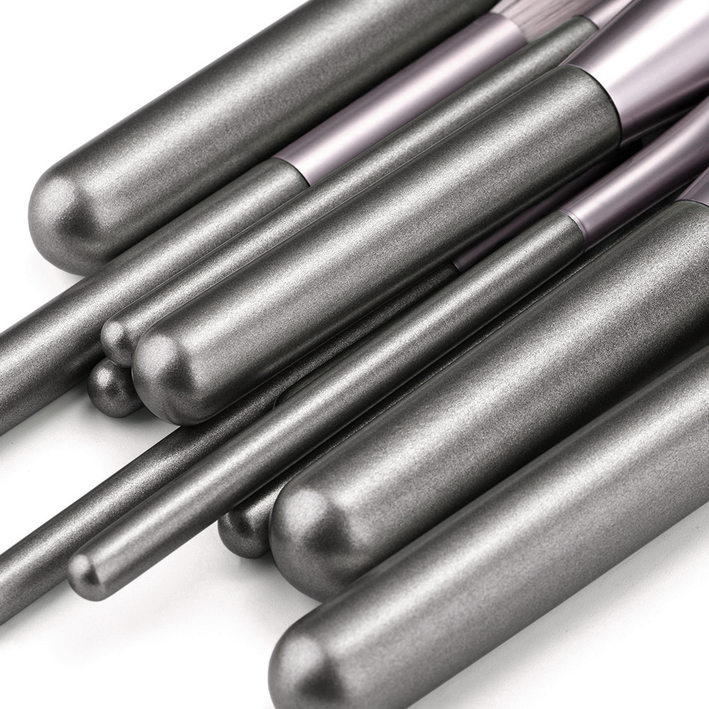 Ексклюзивний набір із 12 професійних пензликів для макіяжу з елегантною косметичкою модного металевого брудно-рожевого кольору.