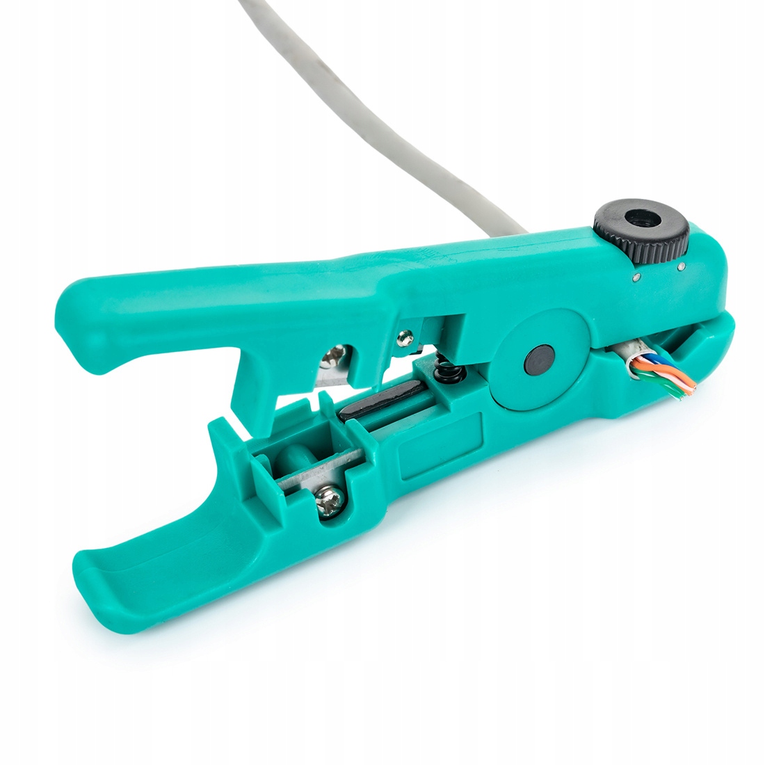 Пристрій для зняття ізоляції з кабелю з ножицею дозволяє ефективно підготувати кабель для приєднання штекера RJ. Невеликий пристрій має ергономічний корпус, який забезпечує міцний і зручний хват під час роботи. Оснащений чотирма лезами (секція для зняття ізоляції з круглих телефонних кабелів, секція для зняття ізоляції з плоских телефонних кабелів, секція для різання та вирівнювання проводів) може використовуватися як для кабелів UTP, так і для FTP. Додатково пристрій має ручку для регулювання глибини різання.