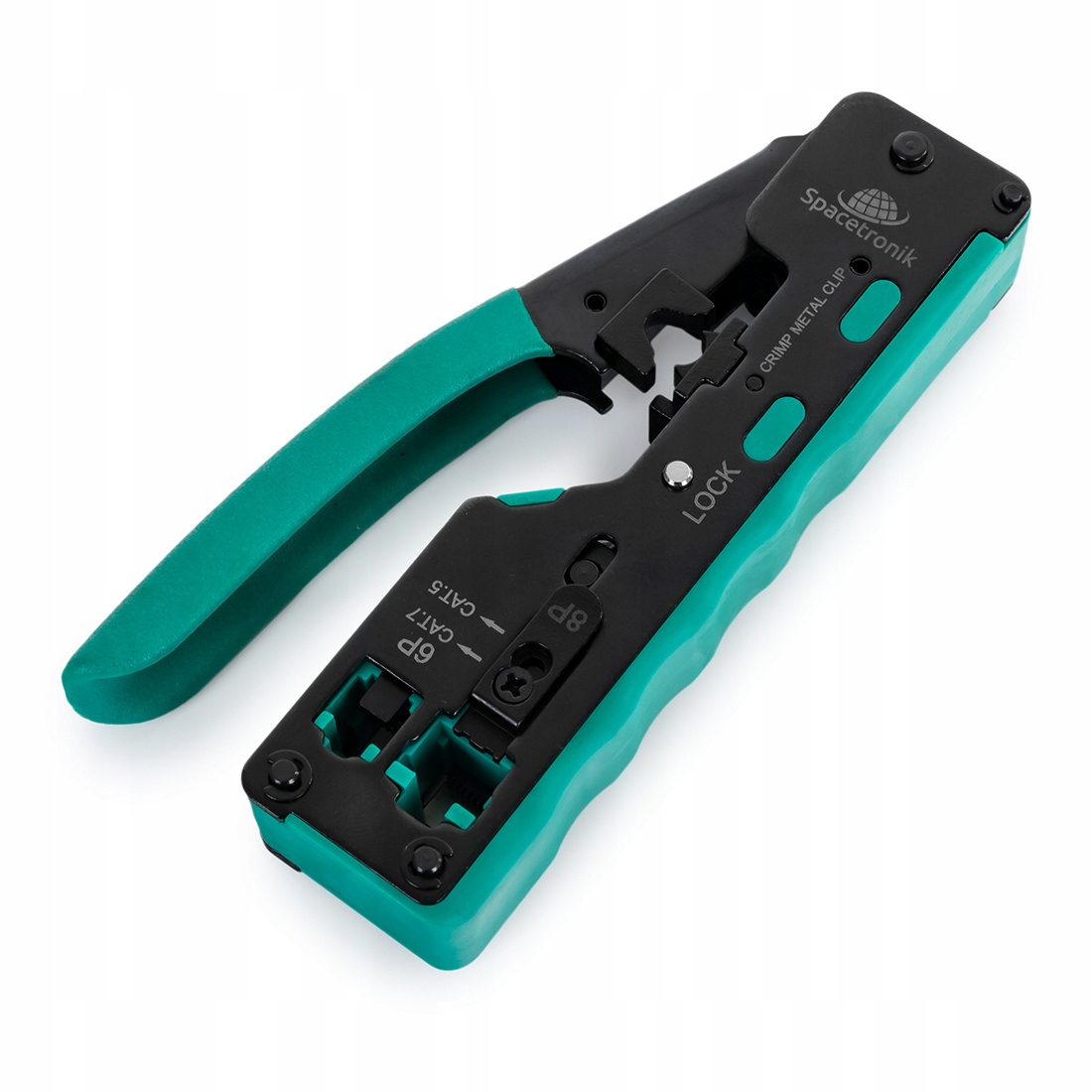 Крімпер Spacetronik дозволяє обтискати штекери RJ45, RJ12 і RJ11 на ІТ-кабелях. Заглушки точно опресовуються завдяки паралельному веденню обтискного елемента і механізму, що запобігає неакуратному обтиску. Інструмент призначений для генерації так званих конекторів. наскрізні отвори, через які проходять і виступають дроти кабелів, що значно полегшує перевірку правильності розташування. Помістивши таку вилку в камеру, обтискач одночасно притисне вилку і точно обріже стирчачі дроти.