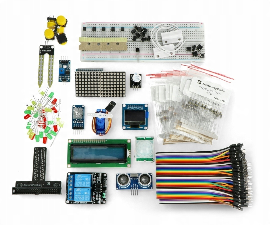 Набір, що складається з прототипних елементів, які можна використовувати з будь-якою версією Raspberry Pi, обладнаною 40-контактним роз’ємом GPIO. З цим набором ви навчитесь принципам роботи окремих електронних компонентів та програмуванню на Python. Набір включає, серед іншого: з’єднувальні кабелі, макетна плата, різні типи датчиків, дисплеї, сервоприводи та багато іншого.