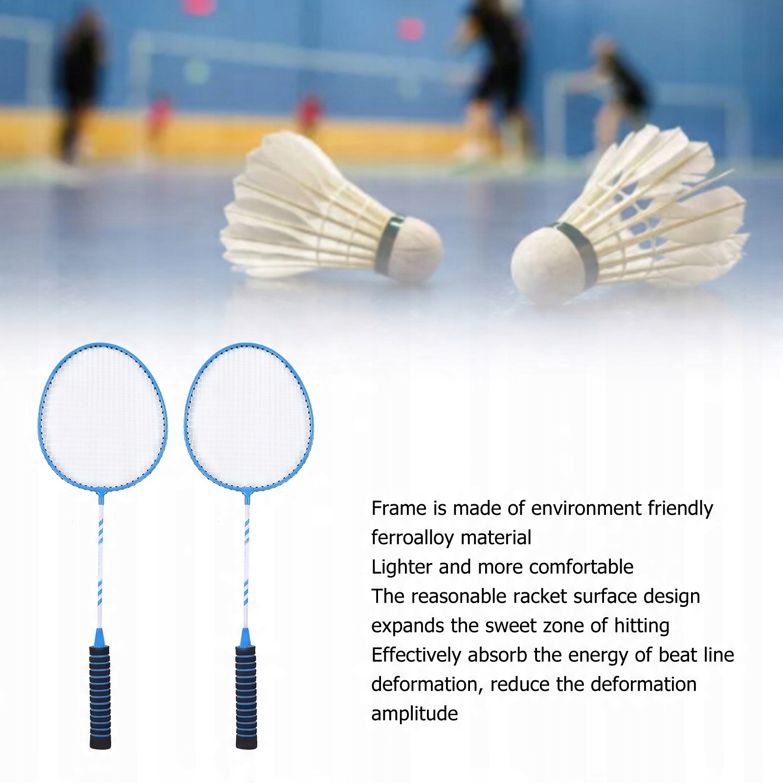 Особливість: 1. Екологічно чистий Ferroalloy: ракетна рама виготовлена з екологічно чистого матеріалу Ferroalloy, який є легшим та зручним, забезпечуючи ракетку більше потужності та зменшуючи вагу на руці користувача.