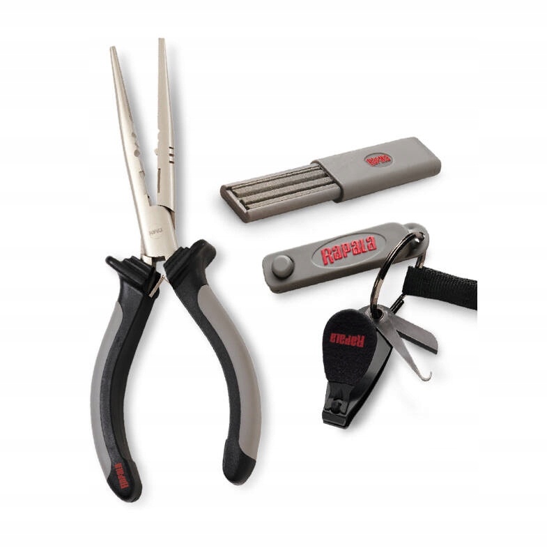 Комбінований набір включає 16-сантиметрові рибальські плоскогубці, точило для гачків, рибальський різак Rapala.