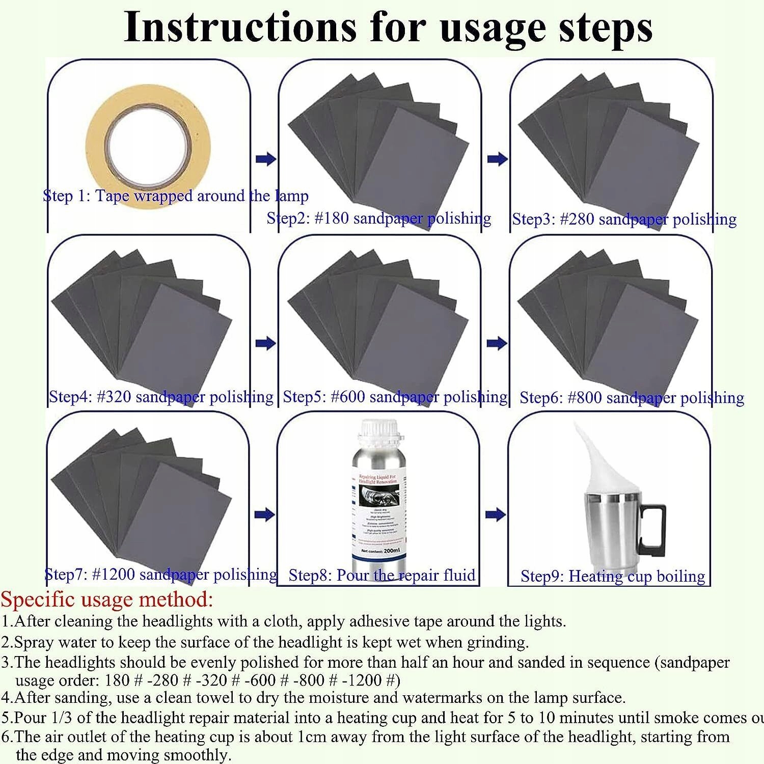 【Поради】 Не зберігайте продукт на сонці. Комплект для ремонту фари може ефективно усунути подряпини від фари автомобіля та вирішити проблеми розмивання, розмивання, окислення, плям, старіння та інших проблем. Під час подрібнення використовуйте воду. Це запобігає надмірному нагріванні поверхні лампи та втрачаю ефективність наждачного паперу. Шліфування вимагає терпіння, щоб видалити всі тріщини, подряпини та пожовтіння. Після очищення протріть поверхню лампи вологою тканиною і перевірте, чи вона рівномірно відшліфована, чи ви видалите плями на воді і не залишаєте вологу. 4