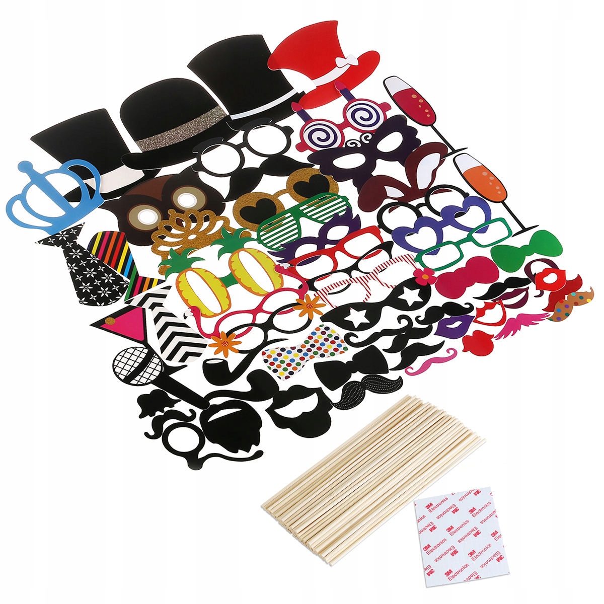 🌈 Переважно включає вуса, різнокольорові окуляри, червоні губи, краватки-метелики, капелюх, кумедну бороду з паперу, маску тощо. Практично необмежена кількість творчих комбінацій і варіантів.