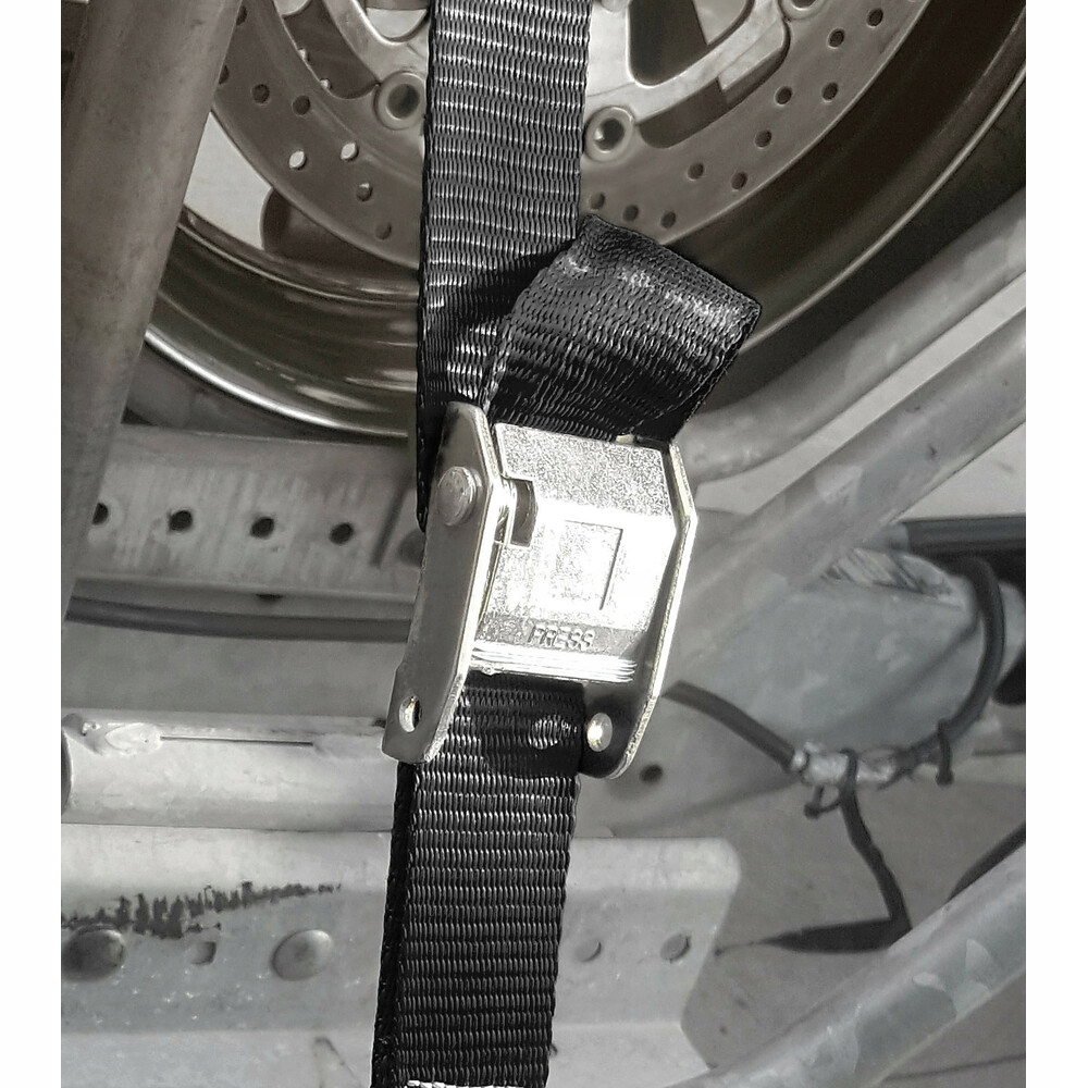 Мотоциклетний ремінь із пряжками для швидкого регулювання натягу. Спеціально для кріплення мотоциклів під час транспортування на причепах і транспортних засобах доставки. Швидке кріплення до причепів за допомогою карабінів. Не допускайте контакту металевих частин з мотоциклом, щоб уникнути подряпин. Розміри: 3,8 х 360 см.