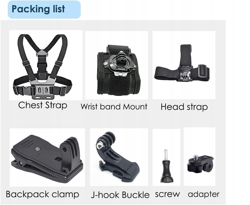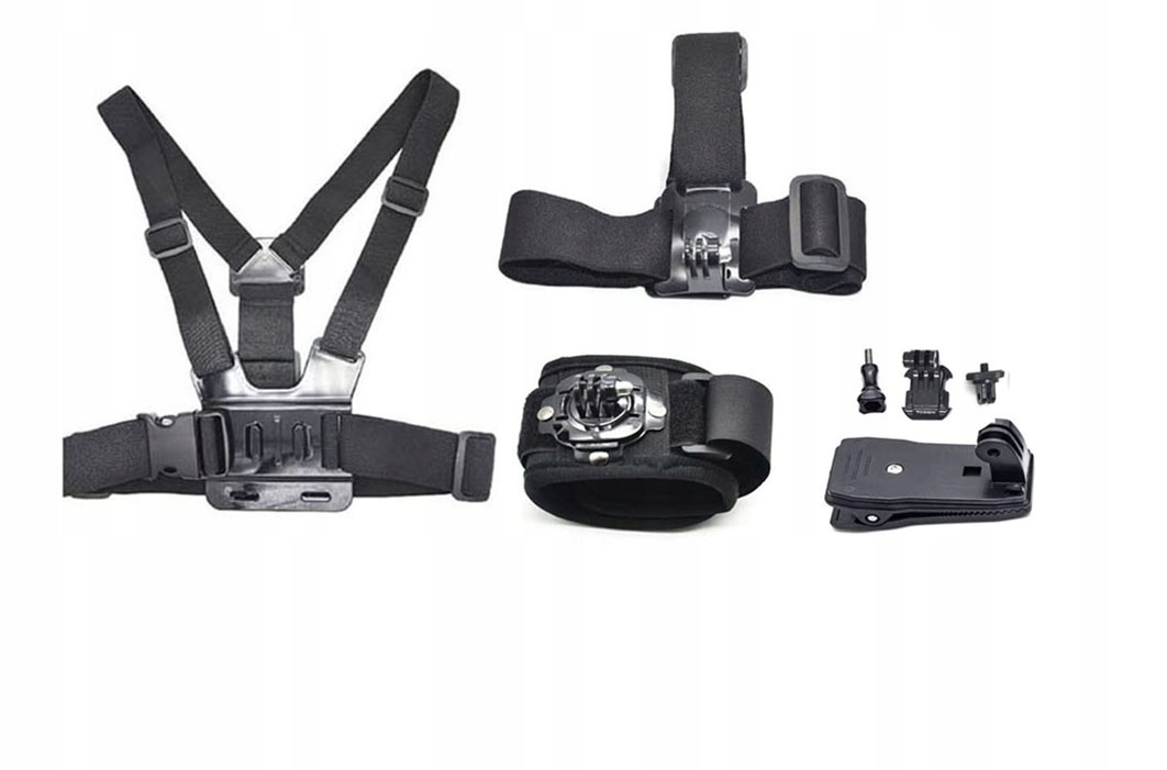 - Набір аксесуарів включає кріплення на грудях, кріплення для рюкзака, кріплення на голову та зап’ястя.