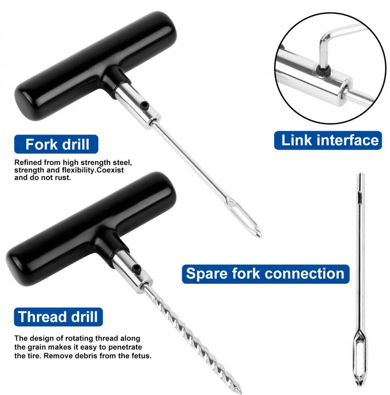 Сперальні та голкові інструменти виготовлені зі загартованої, піскоструминної сталі, що забезпечує більшу міцність. Ці інструменти стійкі до бруду та забруднення - просто протріть їх, і термін їх обслуговування є багаторазовим питанням при ремонті шин.