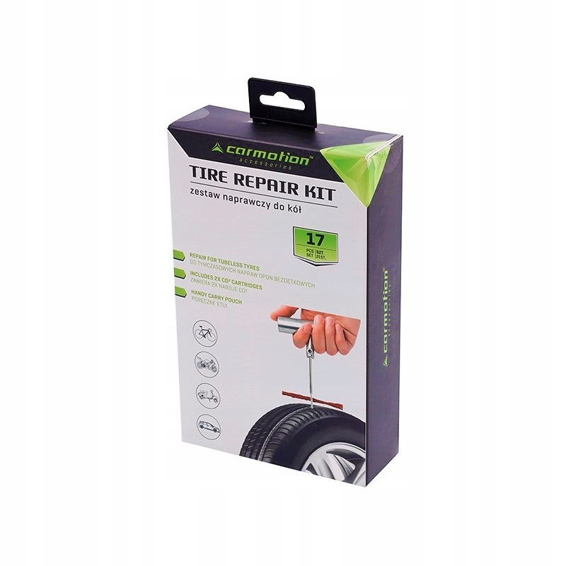 Нехай ремонтний комплект для безкримових шин з насосом CO2 17EL. Бренд Carmotion буде вашим надійним супутником на кожному маршруті. Безпечна подорож завжди у ваших кінчиках!