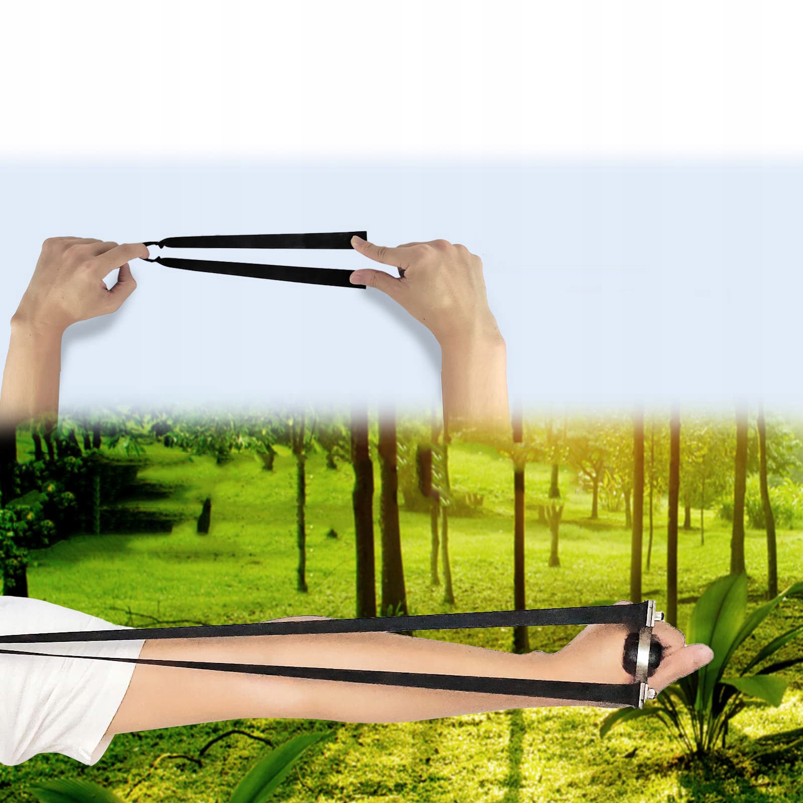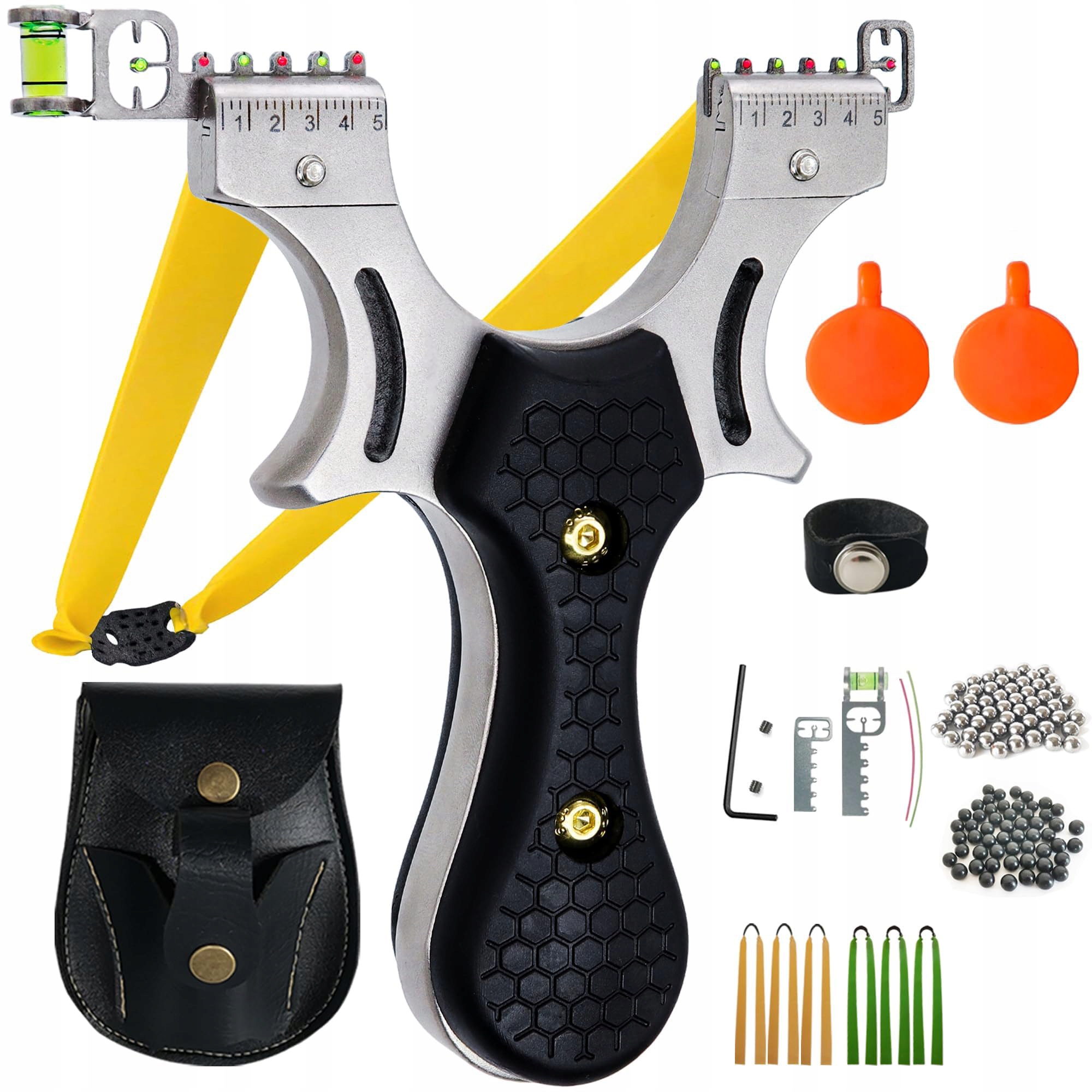 Рогатка оснащена міцними змінними ременями різної товщини. Приціли з нержавіючої сталі допомагають любителям і новачкам тренуватися і точно прицілюватися. повна зйомка в різних сценах.