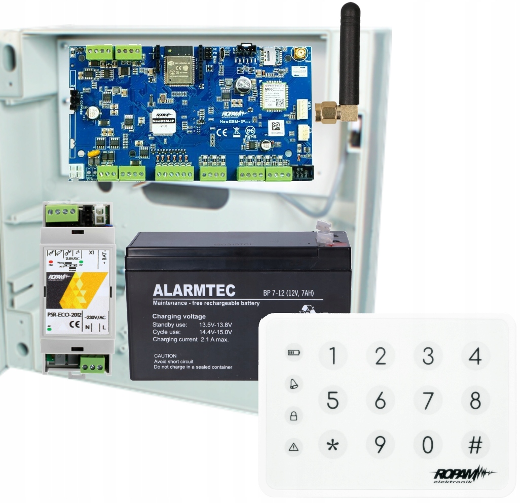 ПАНЕЛЬ УПРАВЛІННЯ СИГНАЛІЗАЦІЄЮ NeoGSM-IP із периферійними пристроями — це рішення, яке об’єднує електронну систему виявлення злому та домашню автоматизацію. Вбудований GSM комунікатор і WI-FI модуль дозволяють дистанційно керувати системою. Завдяки модульній конструкції систему можна розширити та адаптувати до мінливих потреб користувача. Конструкція та функції відповідають стандарту PN-EN 50131-3, рівень 2.