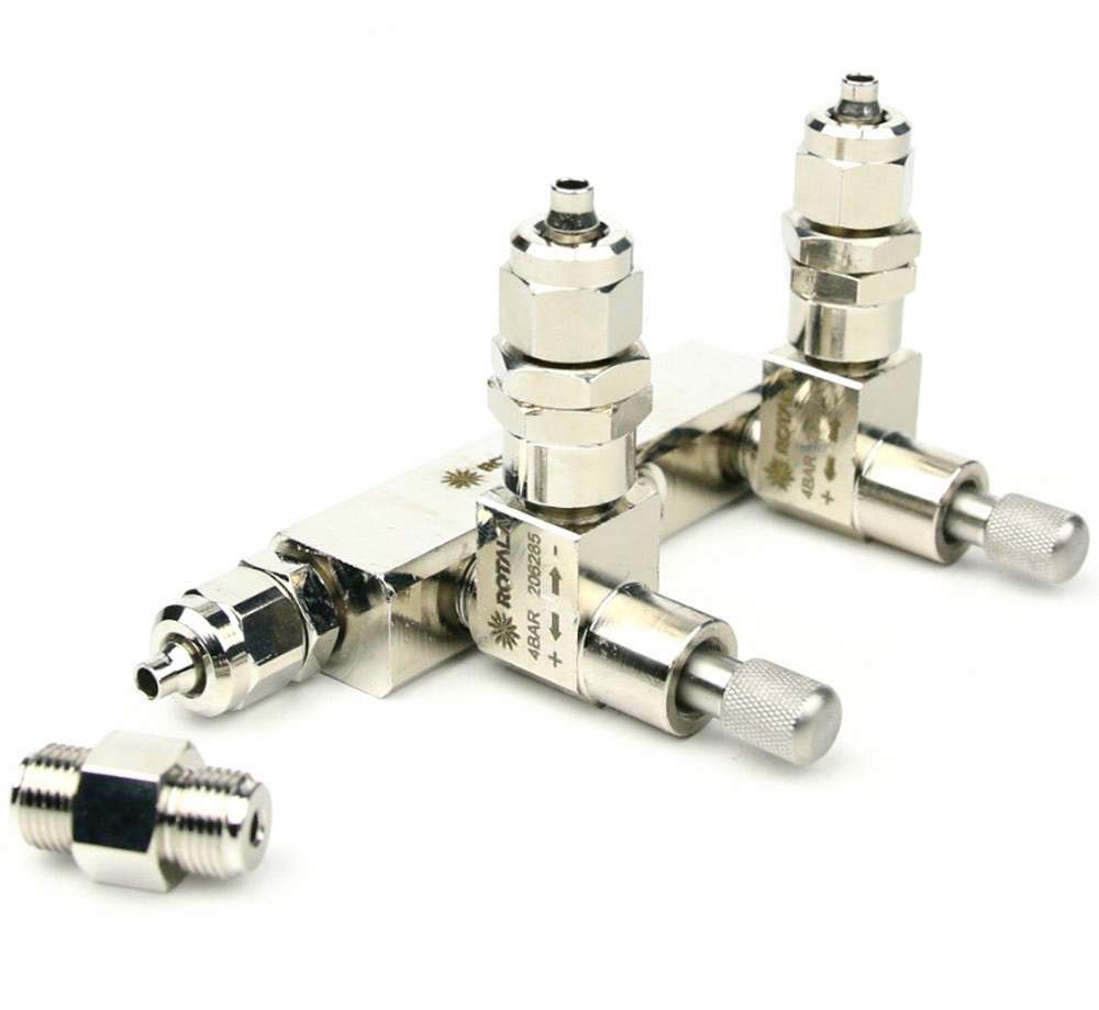 - ROTALA пропонує два типи ТОЧНИХ КЛАПАНІВ для регулювати потік СО2 за допомогою редуктора тиску, тобто зі ЗВОРОТНИМ КЛАПАНОМ (що захищає редуктор та інші елементи системи СО2 від затоплення у разі відключення електроенергії) або без зворотного клапана. Кожен із ТОЧНИХ КЛАПАНІВ також доступний у трьох варіантах, представлених нижче (один вихід, два виходи, три виходи для поліуретанового шланга).