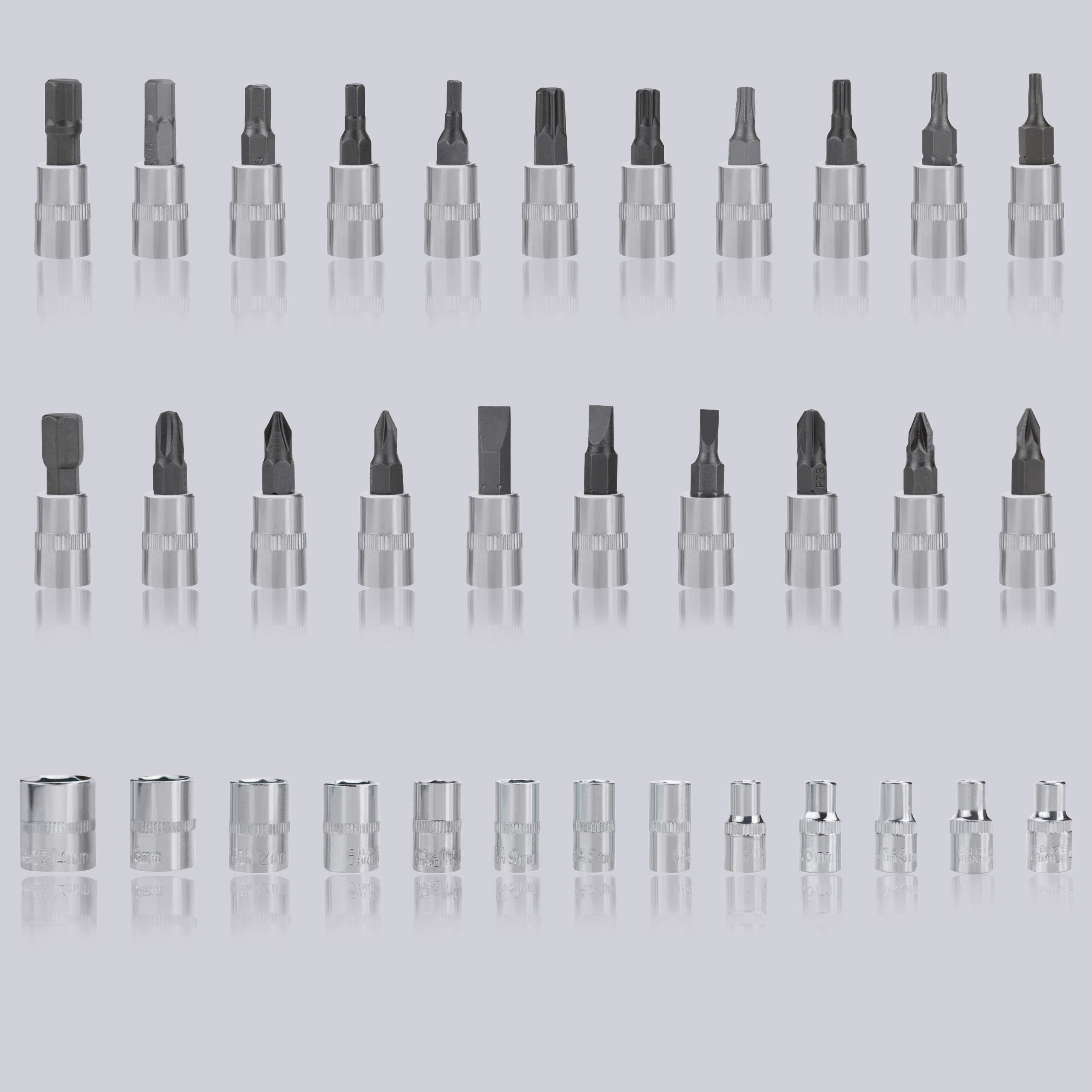 4 1,5; 2; 2,5 6x плоскі викрутки: 4; 5.5; 7 мм 6x поперечні викрутки ph: ph1; PH2; Ph3 6x Перехресна викрутка PZ: PZ1; PZ2; PZ3 6x викрутка Torx: T10; T15; T20; T25; T30; T40 13x 1/4 ": 4; 4,5; 5; 5,5; 6; 7; 8; 9; 10; 11; 12; 13; 14 мм 1x адаптер для наконечника 1x брезенди 1/4" 150 мм 1X