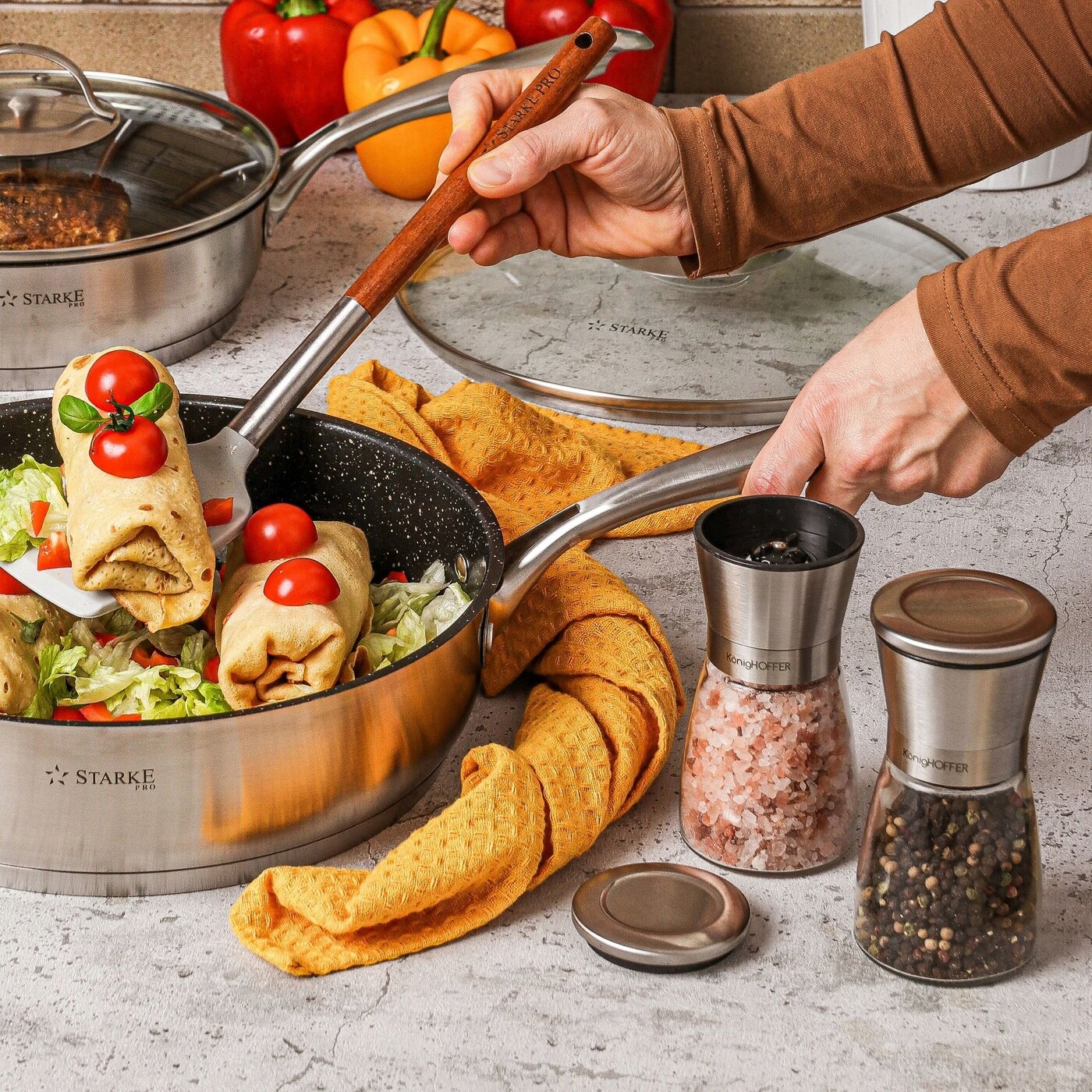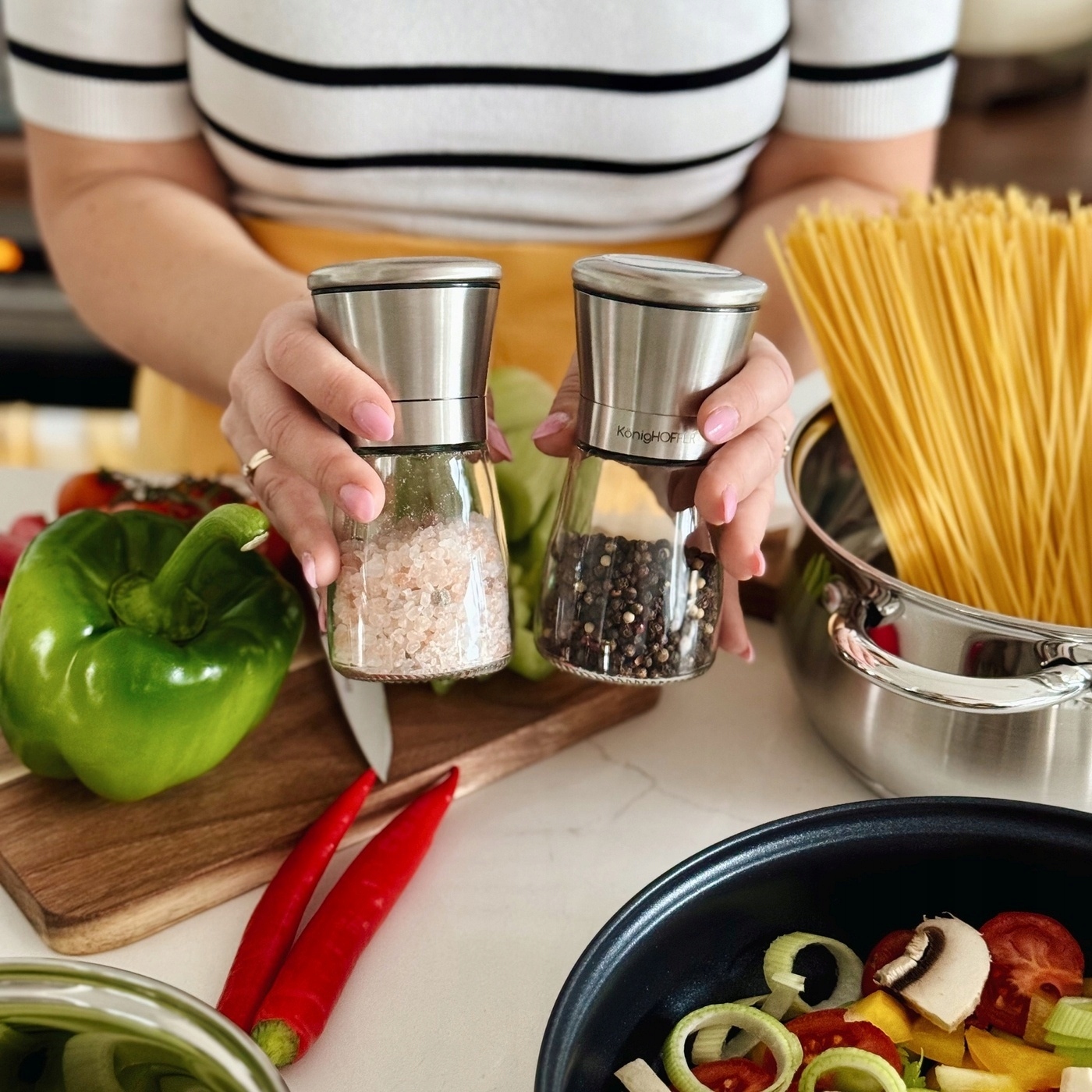 Набір із 2 кухонних ручних м’ясорубок Konighoffer Thor забезпечує короткий час для отримання потрібної кількості спецій. Набір також дозволяє точно відміряти мелений перець або сіль. Жорна оснащені керамічним механізмом подрібнення. Ви можете налаштувати його градацію відповідно до ваших потреб. Таким чином можна подрібнити, наприклад, перець для яєчні і маринаду. У набір входять скляні ємності для спецій і корпуси подрібнювальних механізмів зі срібла і нержавіючої сталі з кришками. Прозора структура дозволяє відстежувати кількість солі та перцю всередині. Тож ви легко знайдете потрібну кухонну м’ясорубку Thor, коли будете готувати. Підходять для гігієнічного зберігання спецій або на подарунок.