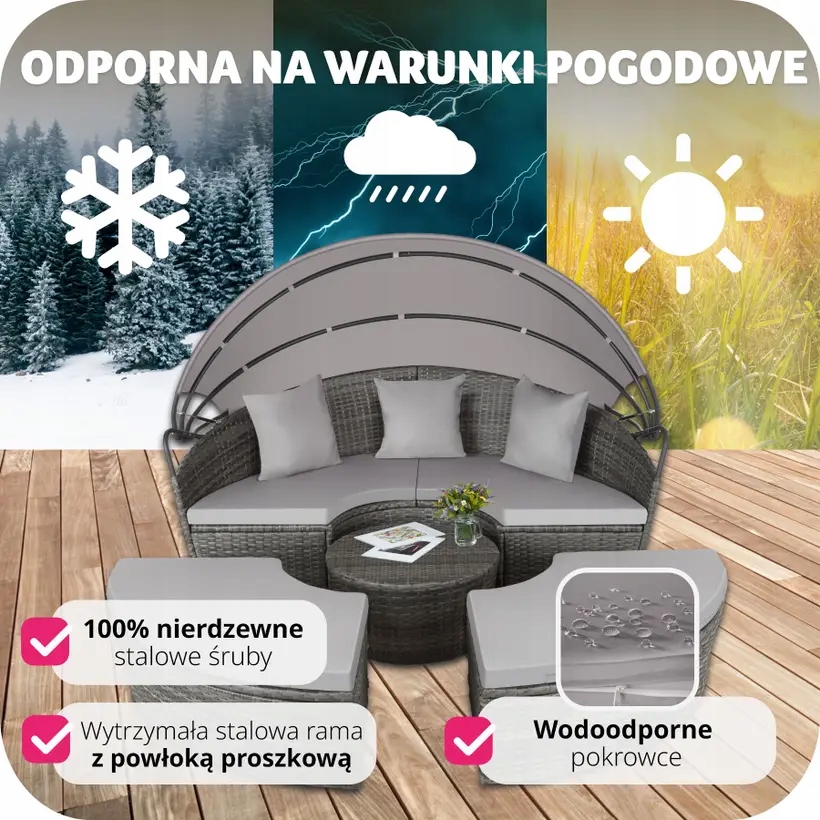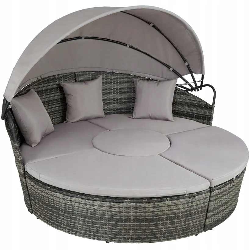 Функціональний сонячний острів з ротанга від tectake характеризується привабливим зовнішнім виглядом і високим комфортом сидіння або лежання. Окремі елементи набору можна комбінувати індивідуально і оснащені водонепроникними подушками. Комплект можна використовувати як багатокомпонентний лаунж гарнітур або як простору кушетку. Суцільний дах кріпиться на липучку і забезпечує захист від спеки та вітру. Ротанговий сонячний острів можна швидко та легко адаптувати до поточних потреб, тому він є обов’язковим у вашому оазисі відпочинку.