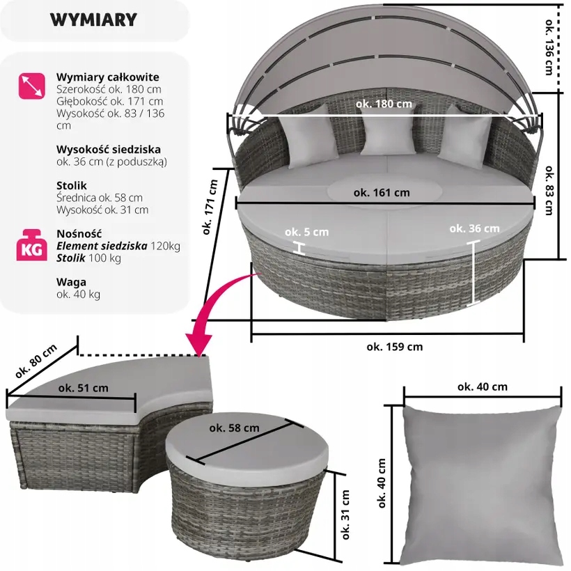 Розміри столу (Ø x В): прибл подушки): приблизно 37 см