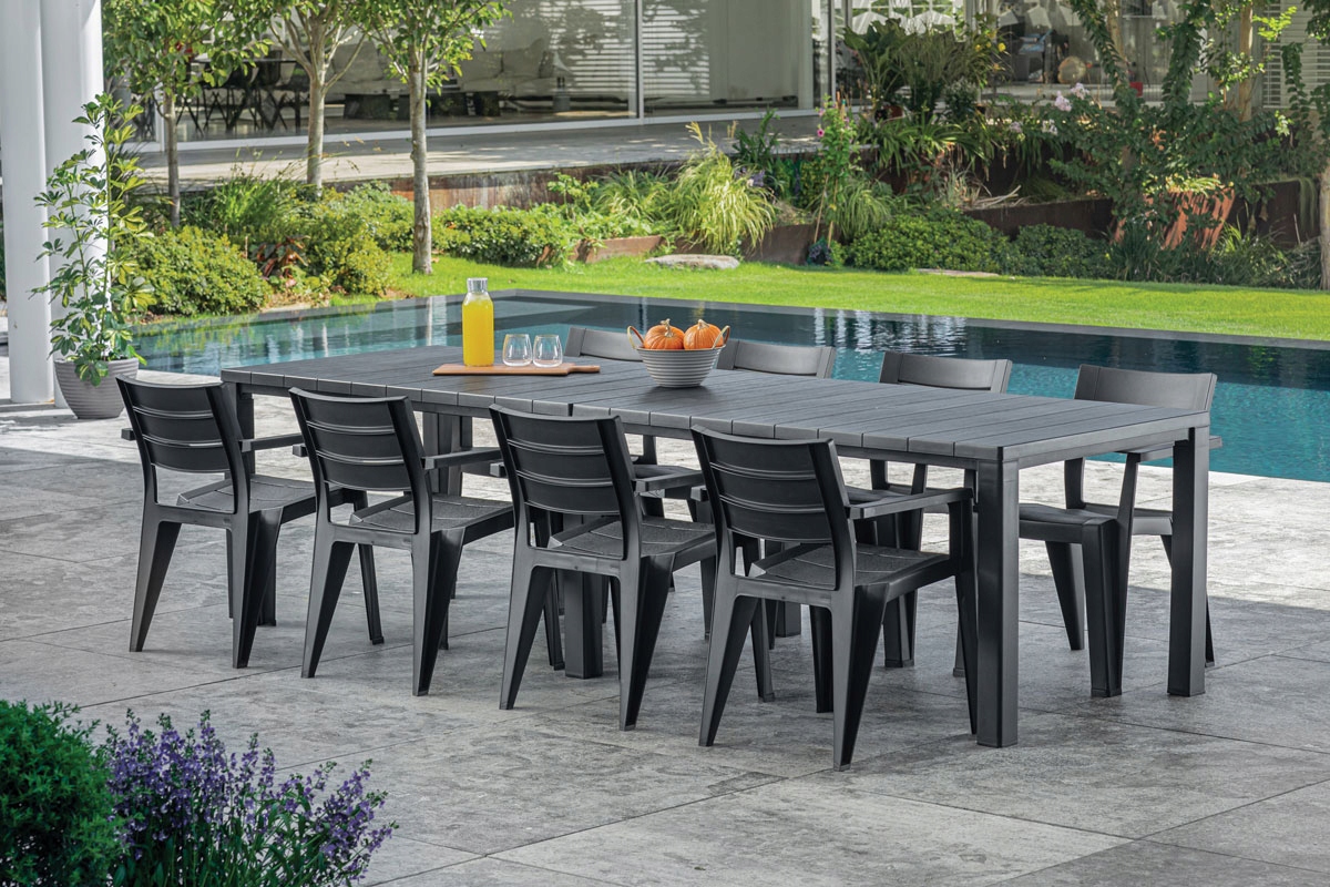Функціональний комплект садових меблів із пластику на десять персон. Ідеально поміститься на терасі, великому балконі або патіо.